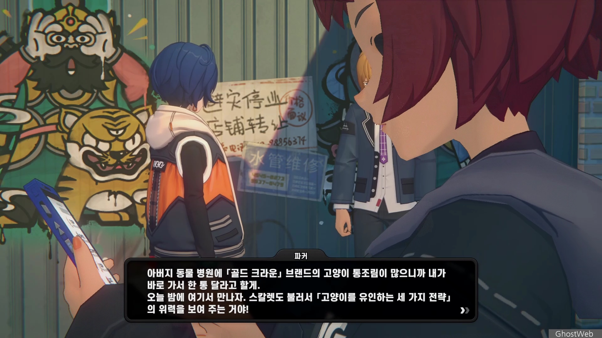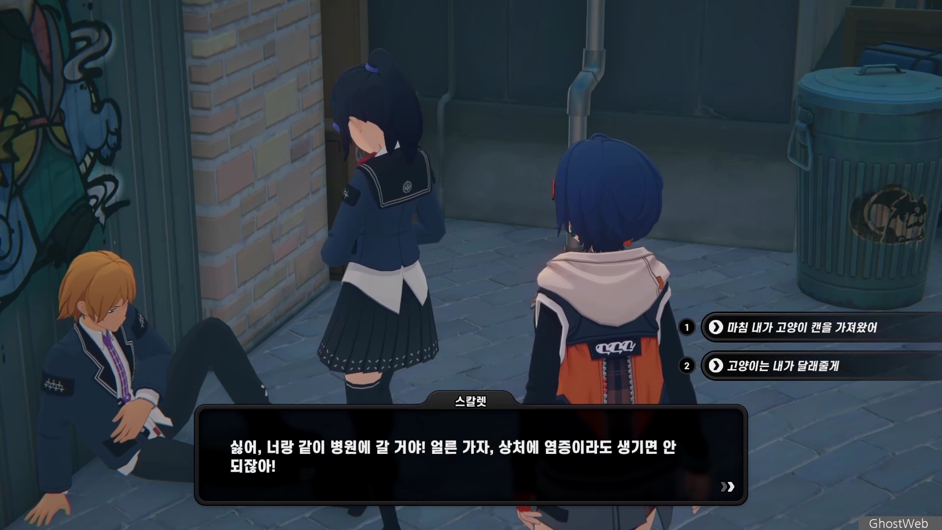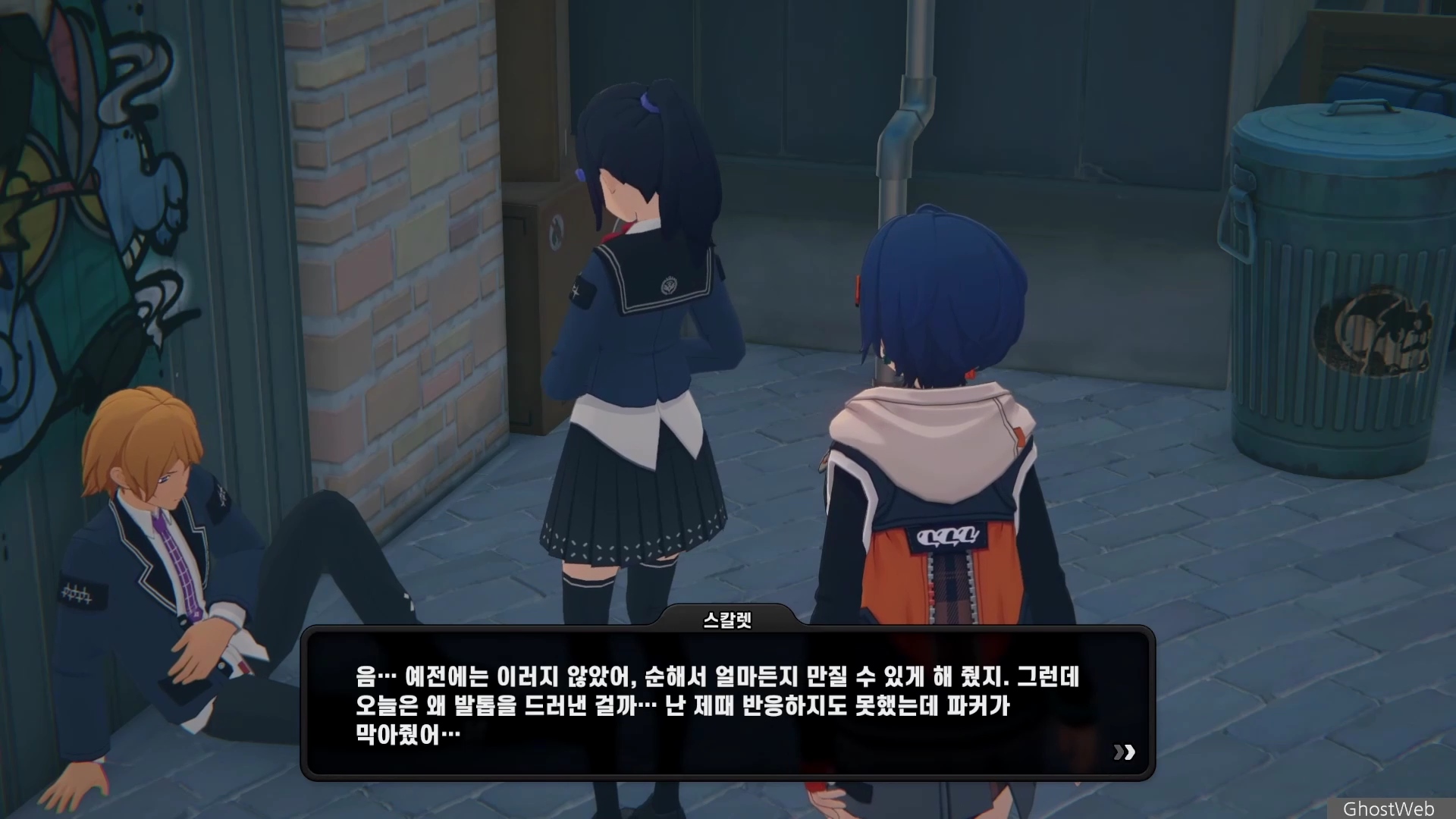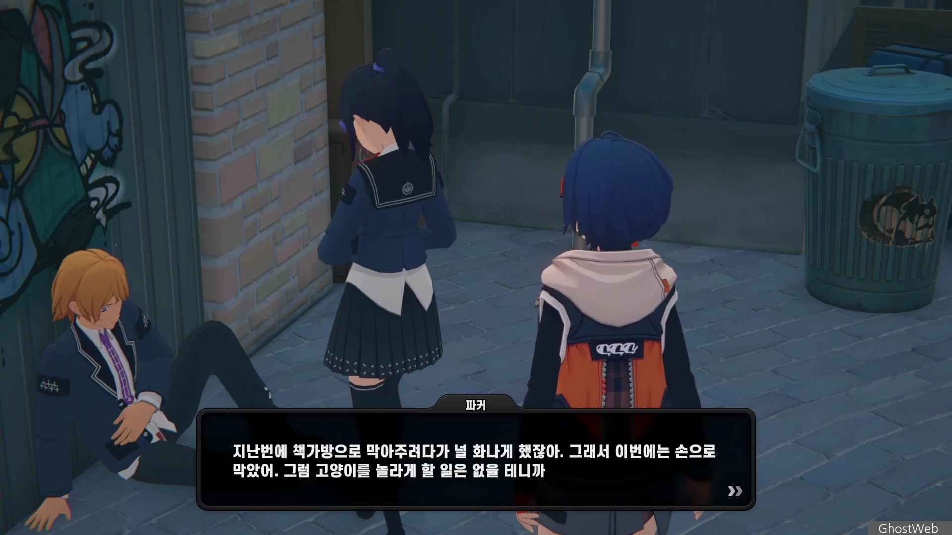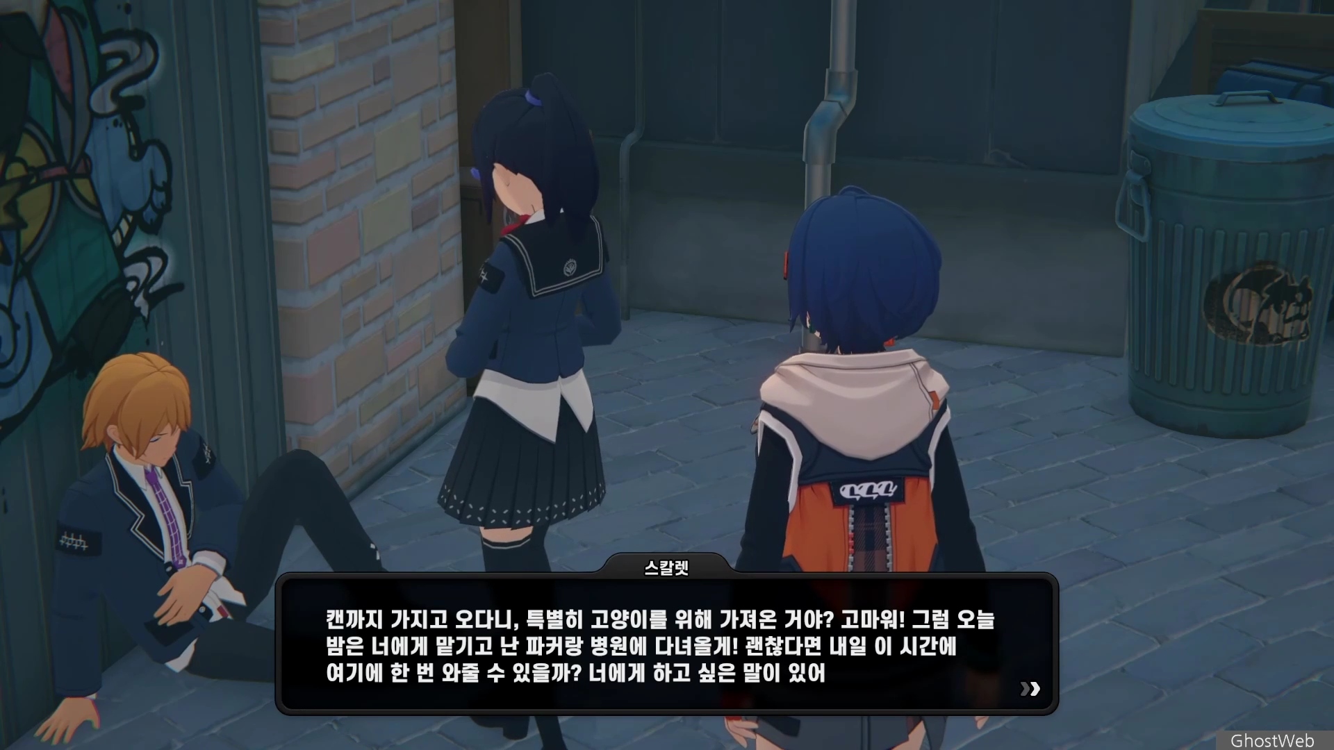 6단지 공터에 스칼렛이라는 학생이 서 있는데 길고양이에 대해 물어보면 도망가는데 오해를 풀기 위해 쫓아갔지만 파커라는 학생과 대화를 해요.