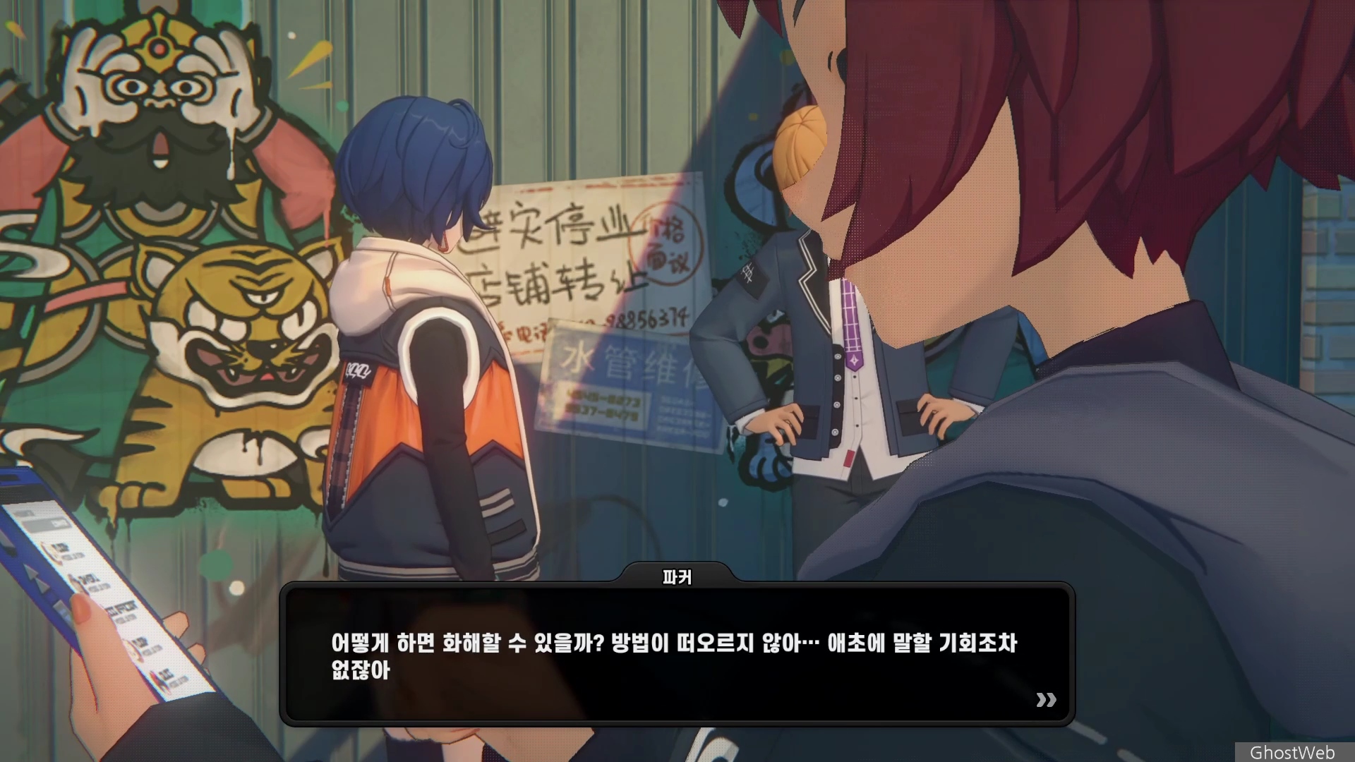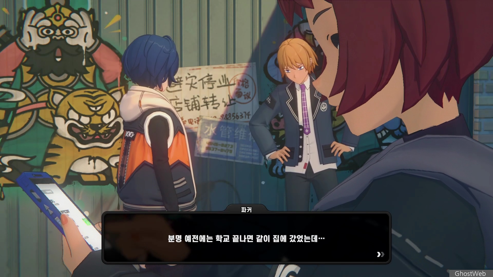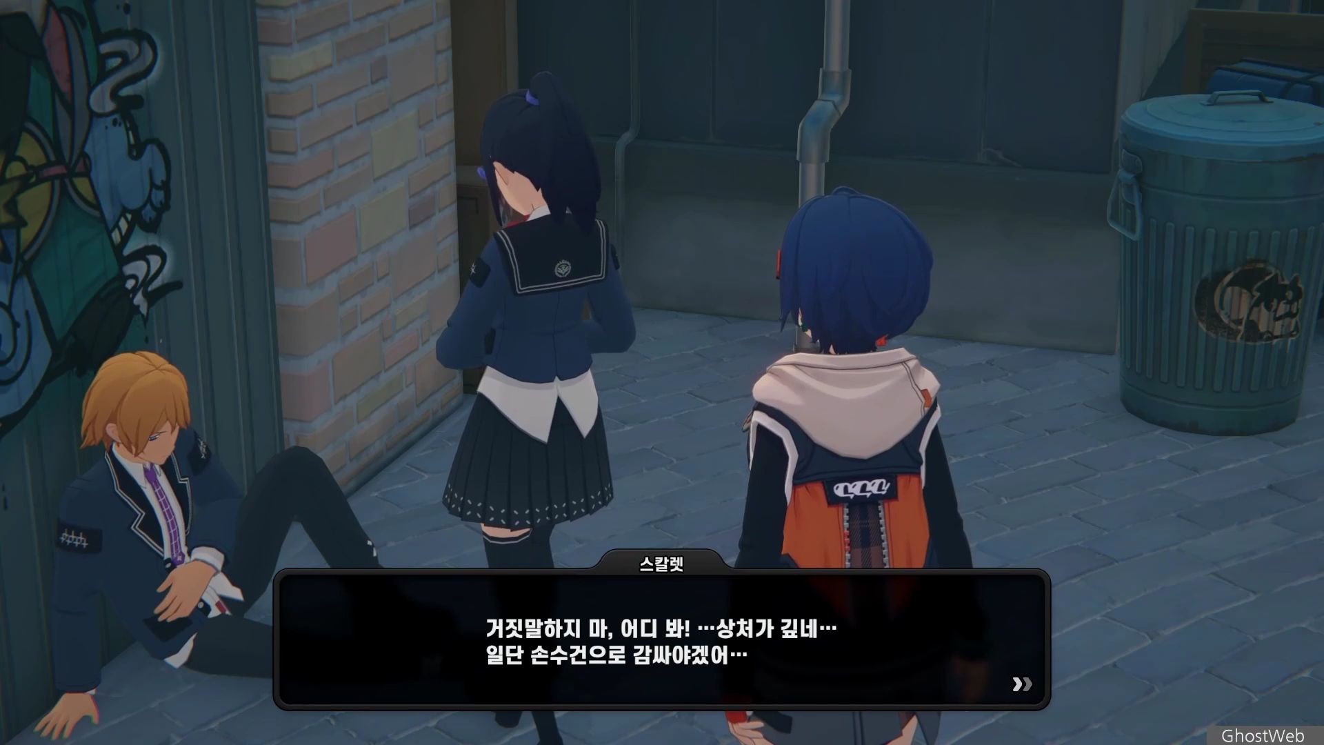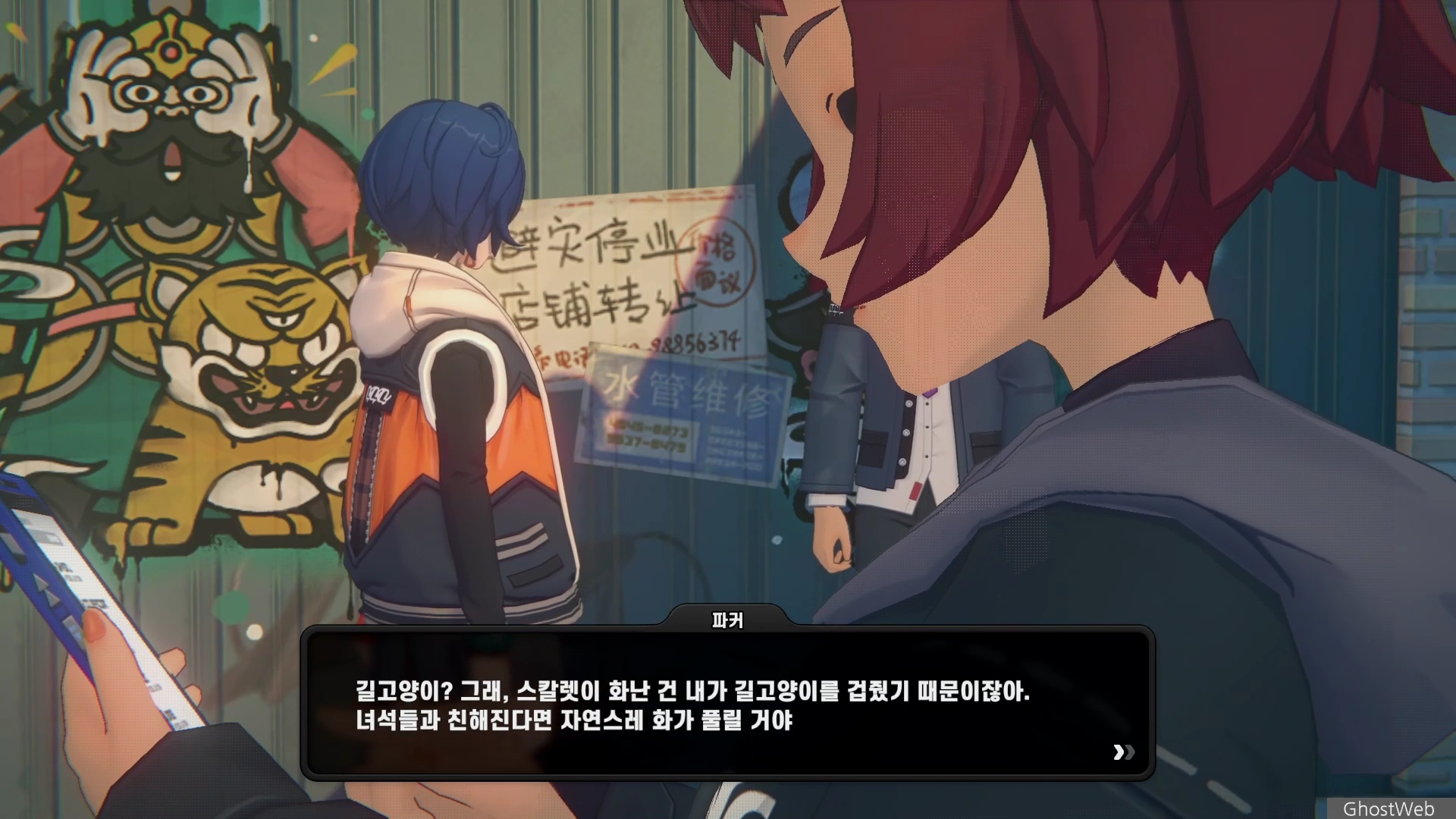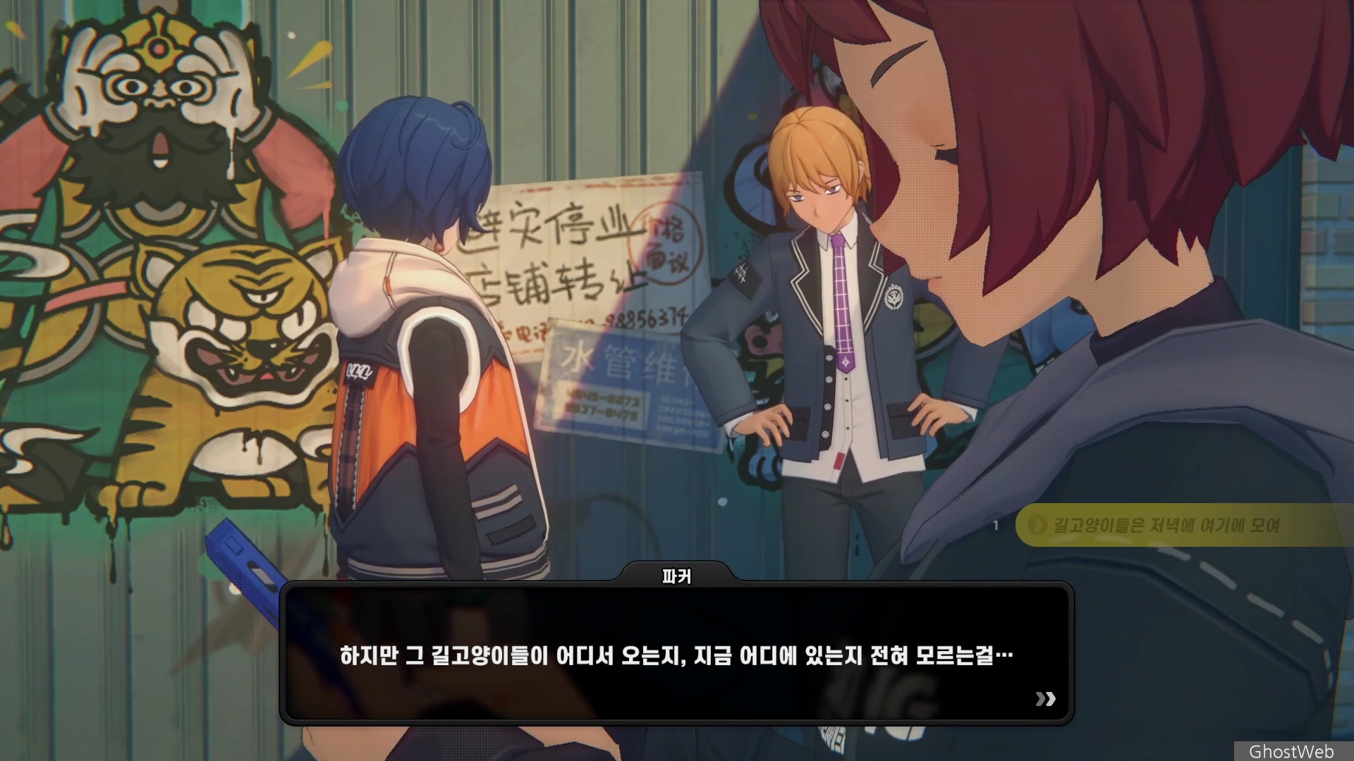 6단지 공터에 스칼렛이라는 학생이 서 있는데 길고양이에 대해 물어보면 도망가는데 오해를 풀기 위해 쫓아갔지만 파커라는 학생과 대화를 해요.