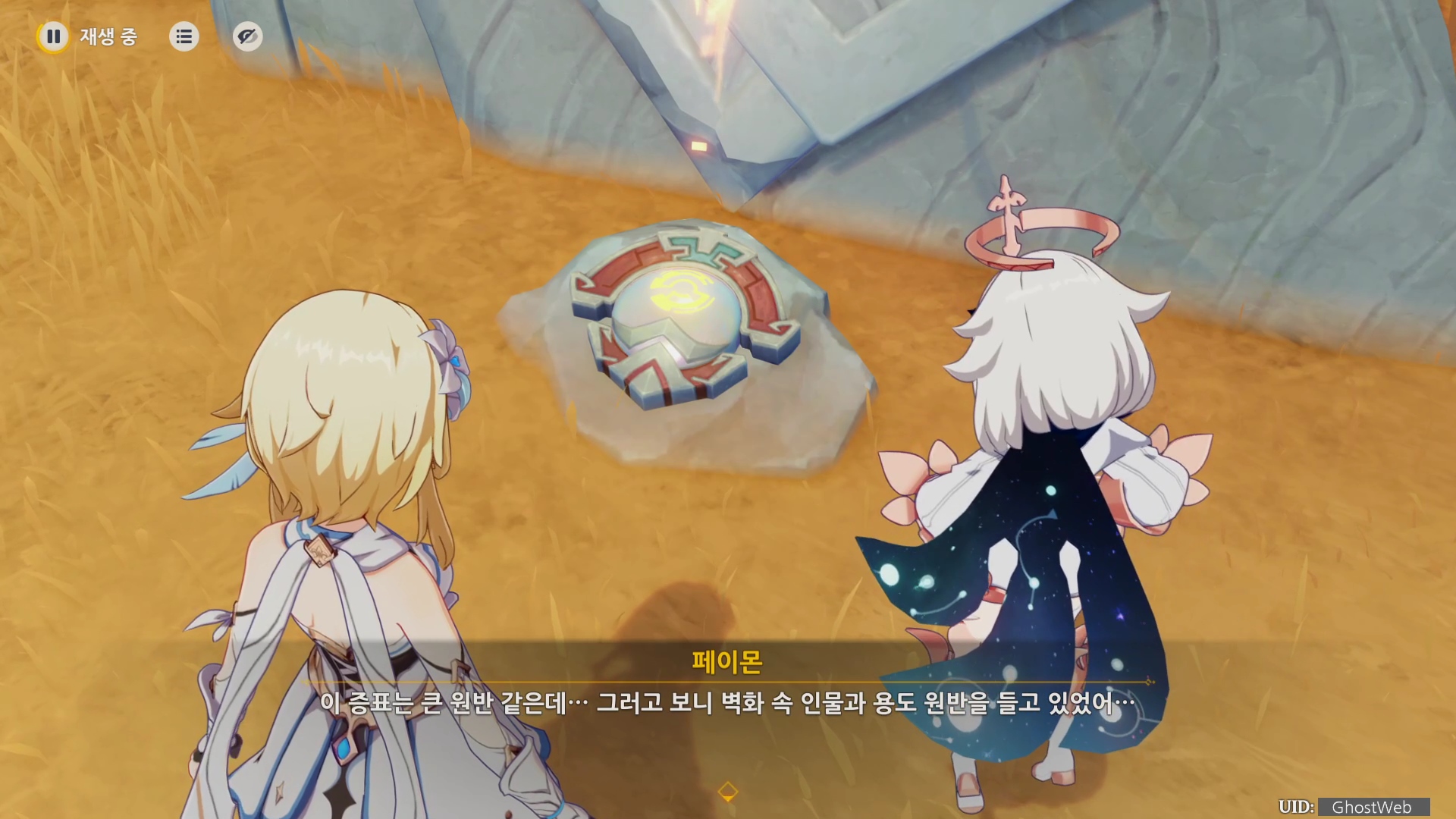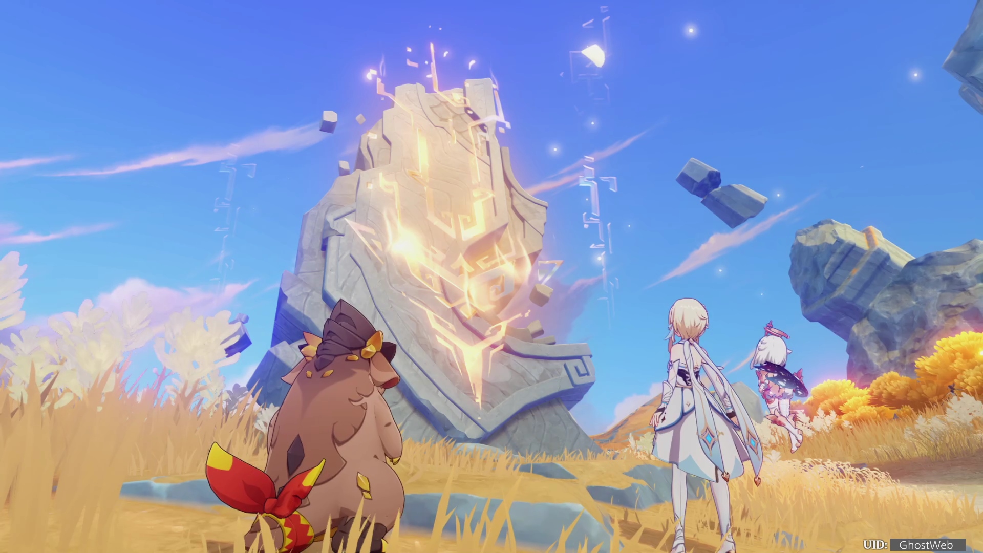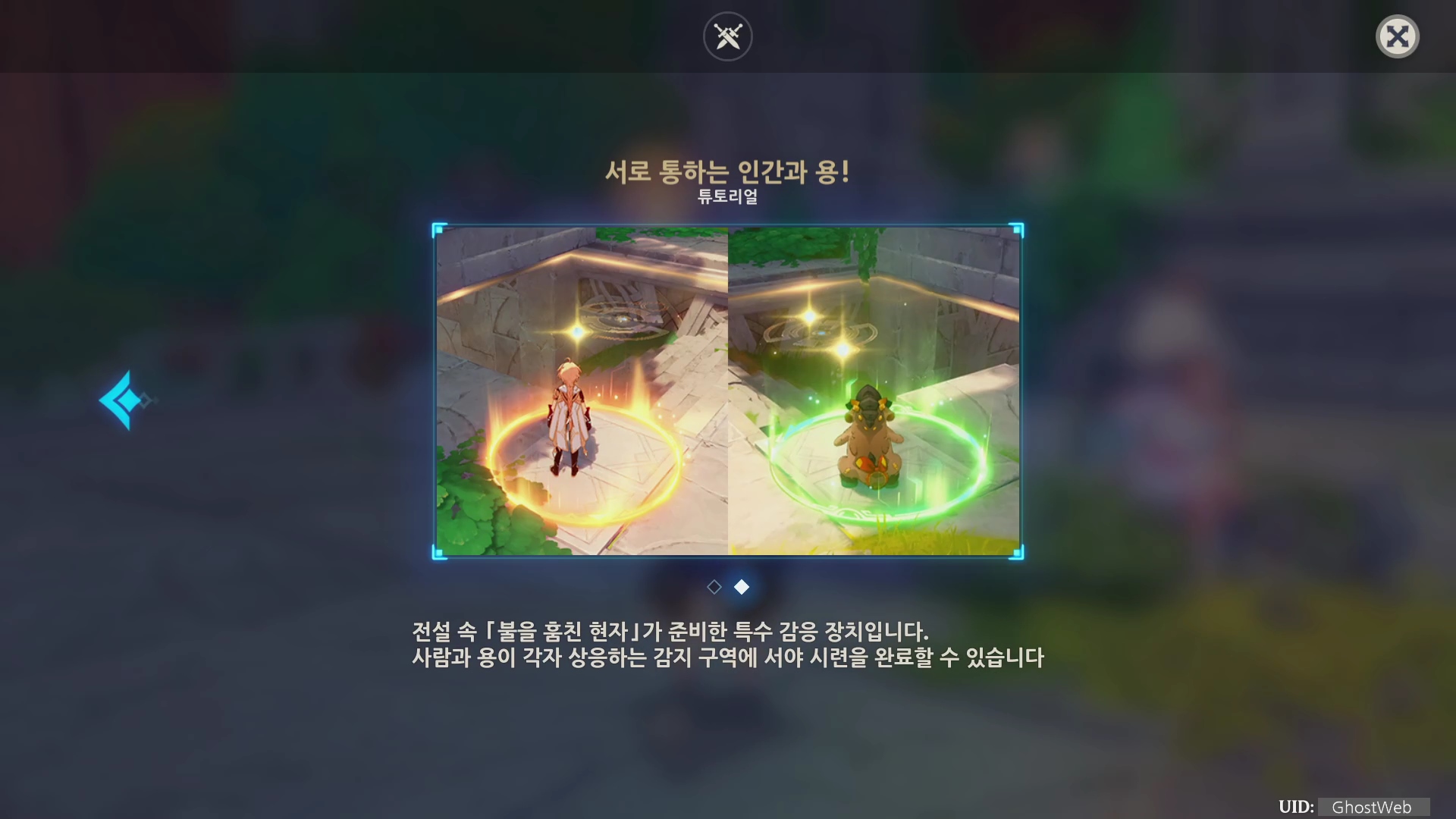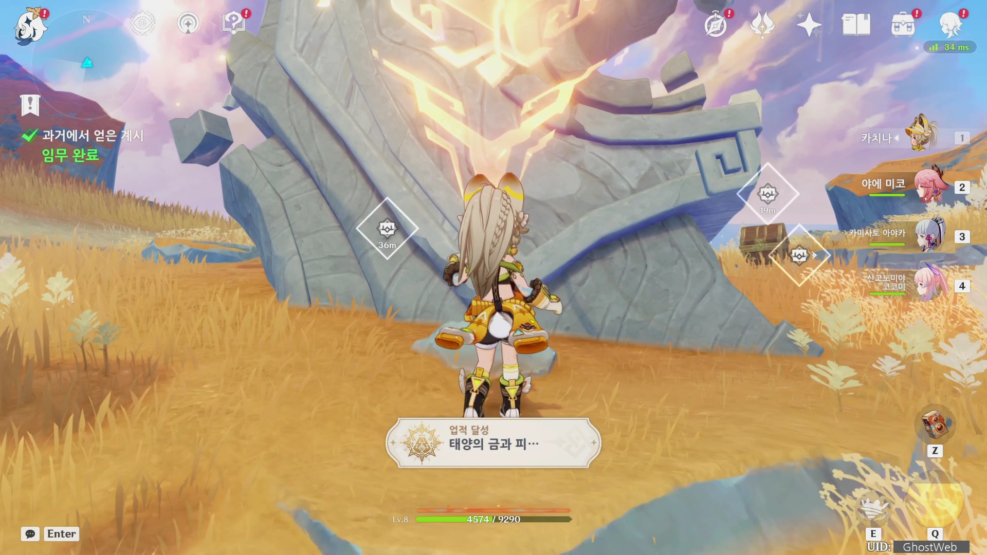 전투가 끝난 후 각문을 만지면 새로운 지역으로 이동하여 중앙에 있는 비석을 만지며 여행자가 잠깐 회상에 빠졌다가 페이몬과 대화를 끝으로 통첩의 금 원반, 보물 상자를 획득하고 [ 태양의 금과 피... ] 업적을 달성할 수 있어요.