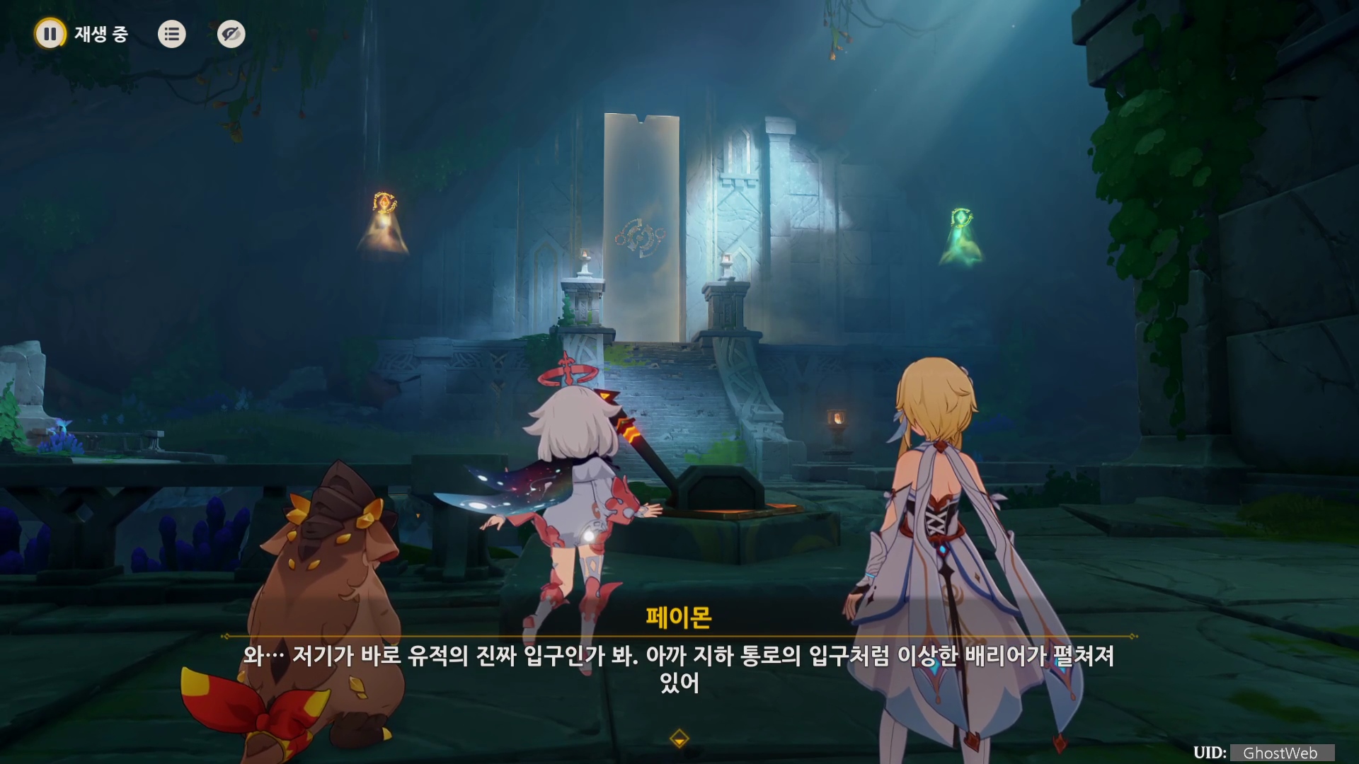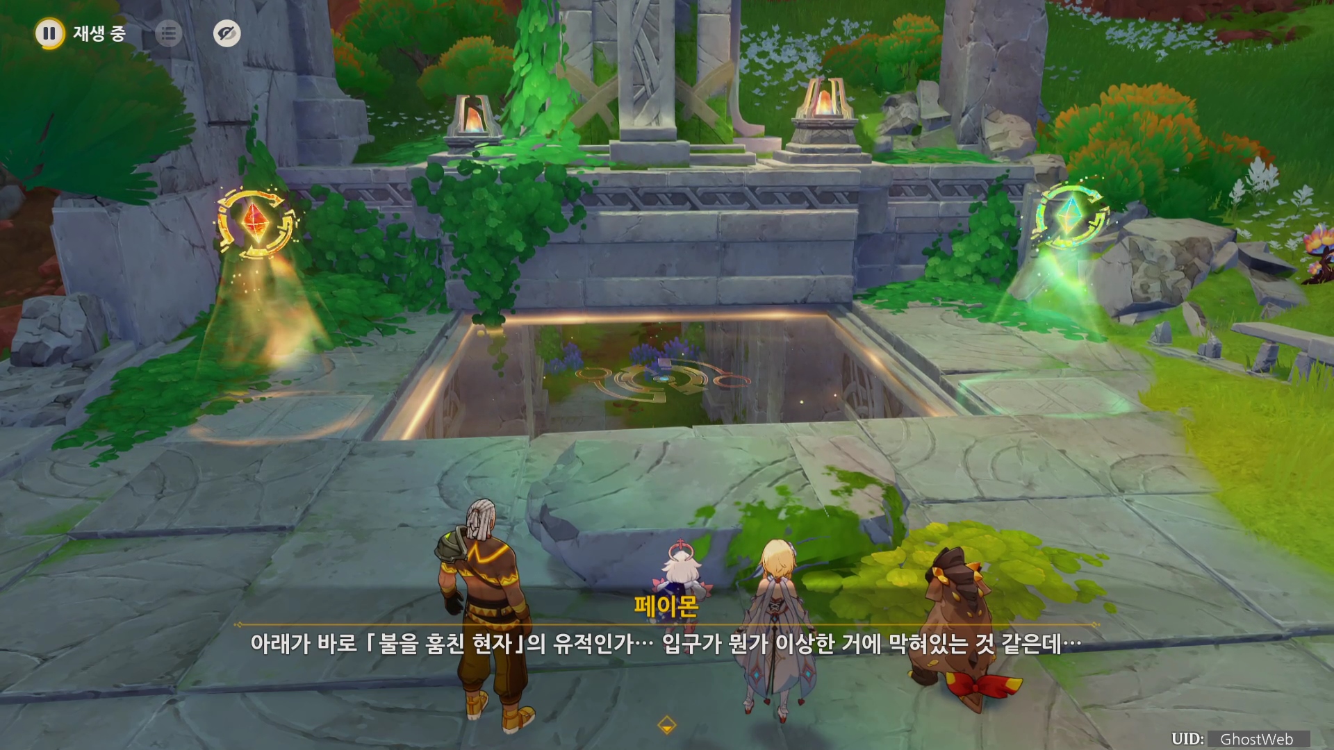 막혀 있는 유적 입구를 열기 위해 여행자, 산룡을 조정하여 각 위치에 배치하면 입구에 베리어가 해제되며 안으로 들어갈 수 있어요. (T키로 전환)