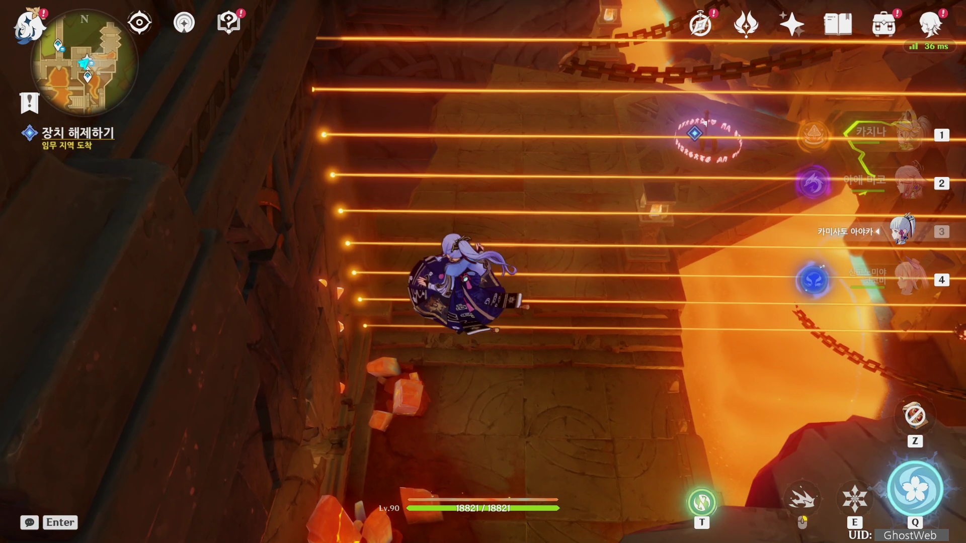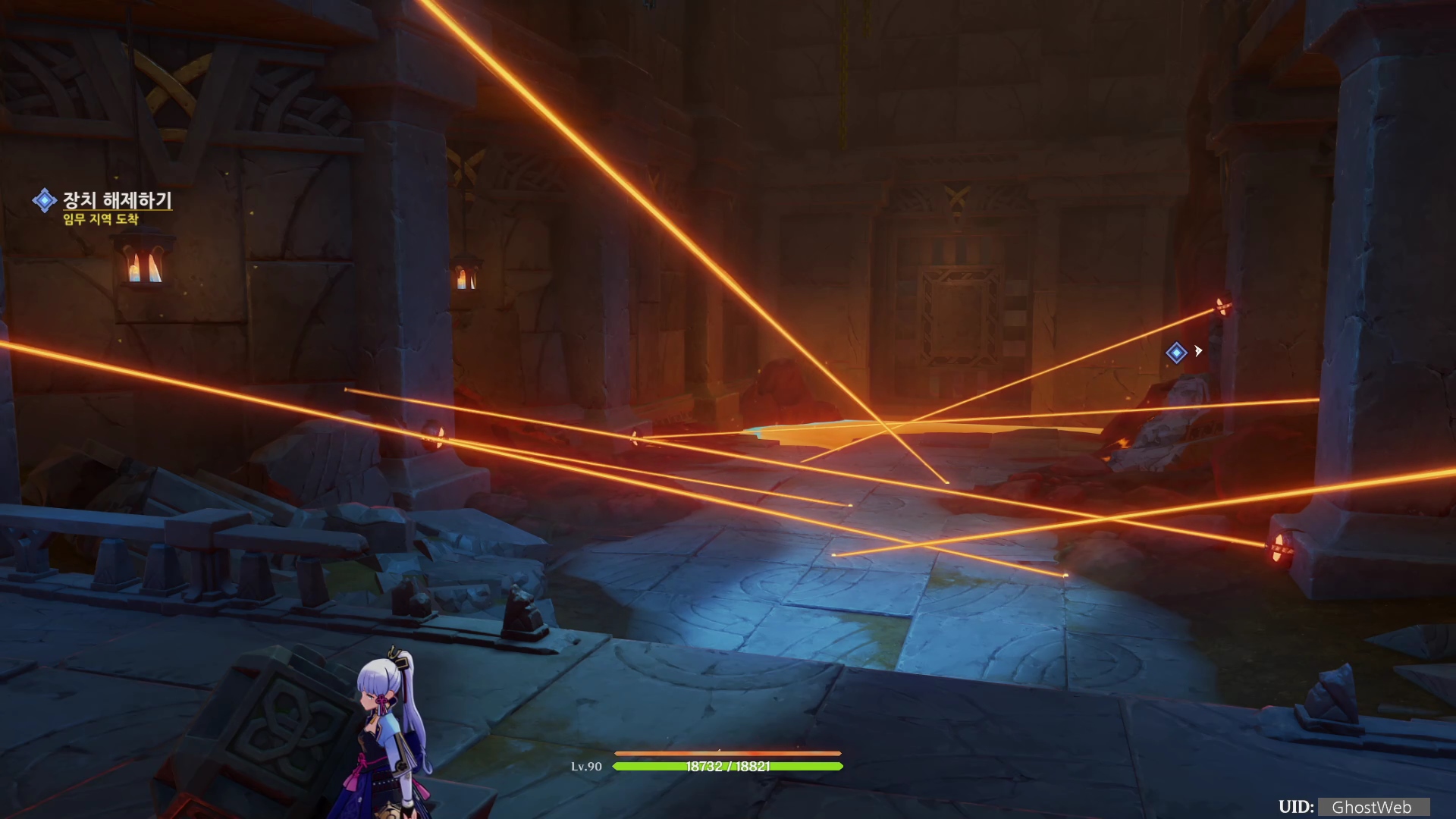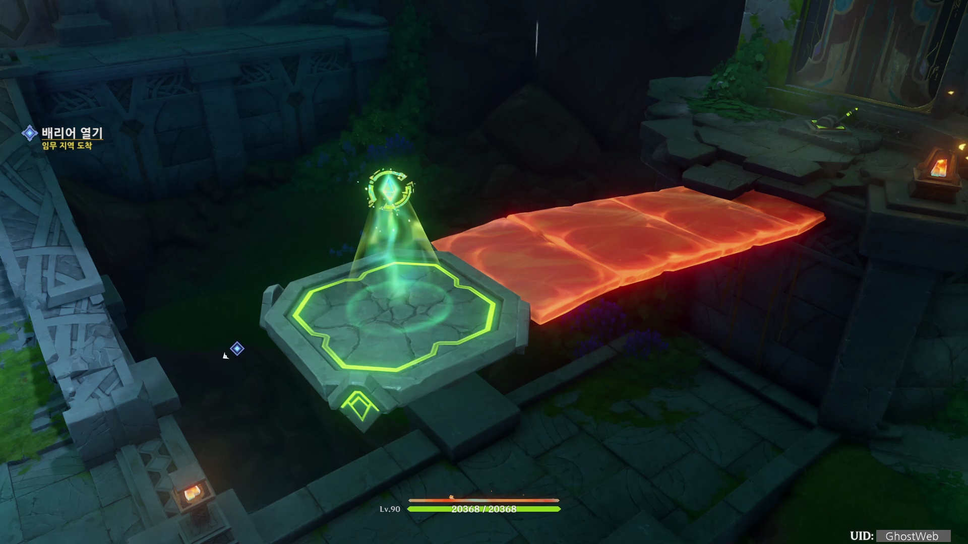 - 광선에 직접 접촉하여 마그마를 올라오게 하여 불 원소 장치 동시에 활성화하고 레버 올리기 (여행자)