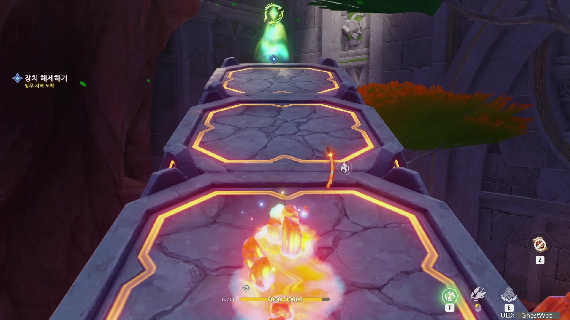 불 원소 장치를 불 원소 캐릭터로 원소 공격을 하면 공중에 있는 녹색 발판과 녹색 레버 사이에 길이 생기니 여행자를 발판에 올려 보내고 산룡은 땅 속 이동을 통해 기둥 위로 올라가 녹색 발판에 올라서면 다음 방 베리어가 해제돼요.