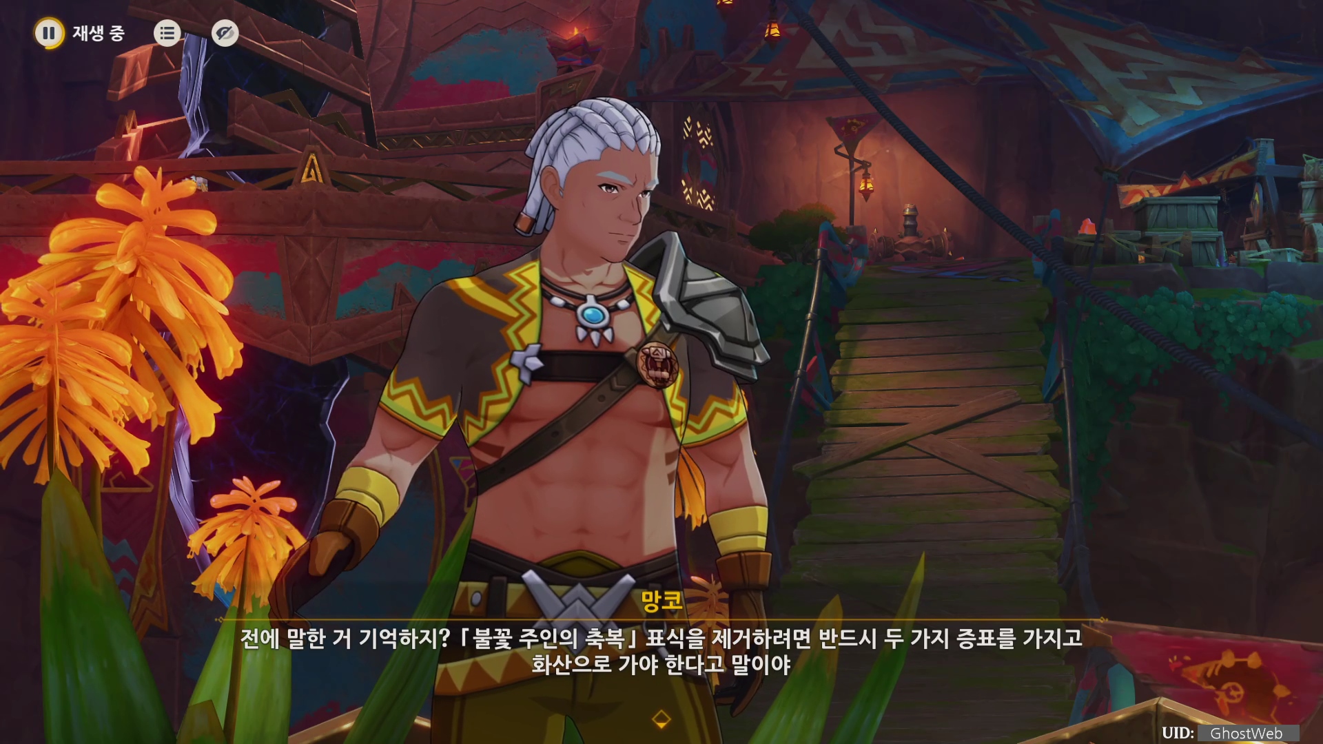 메아리 아이 부족을 방문하면 족장인 파칼과 용 유물 연구 협회 사람인 망코가 이야기를 나누고 있는데, 불꽃 주인의 축복 표식 제거를 위해 증표가 필요한데 이를 모아달라는 부탁을 해요.