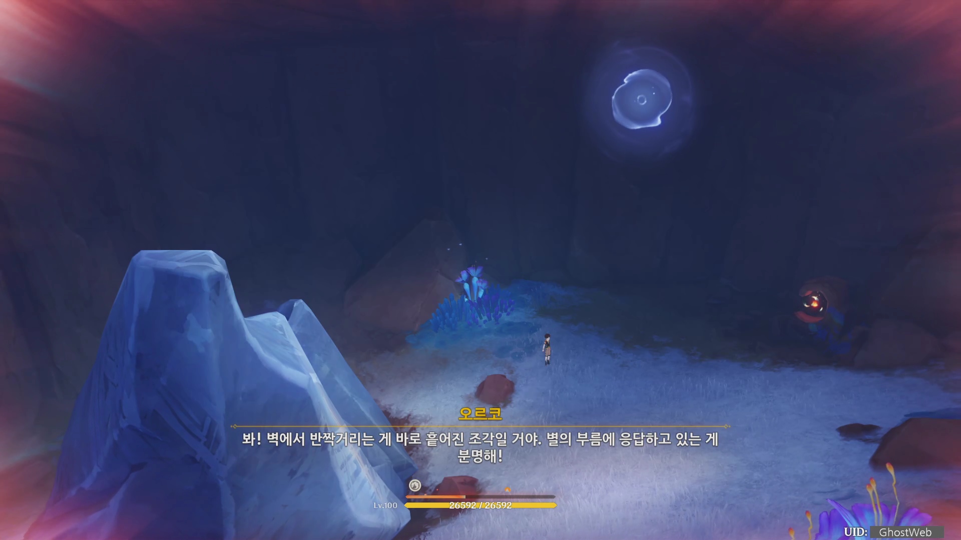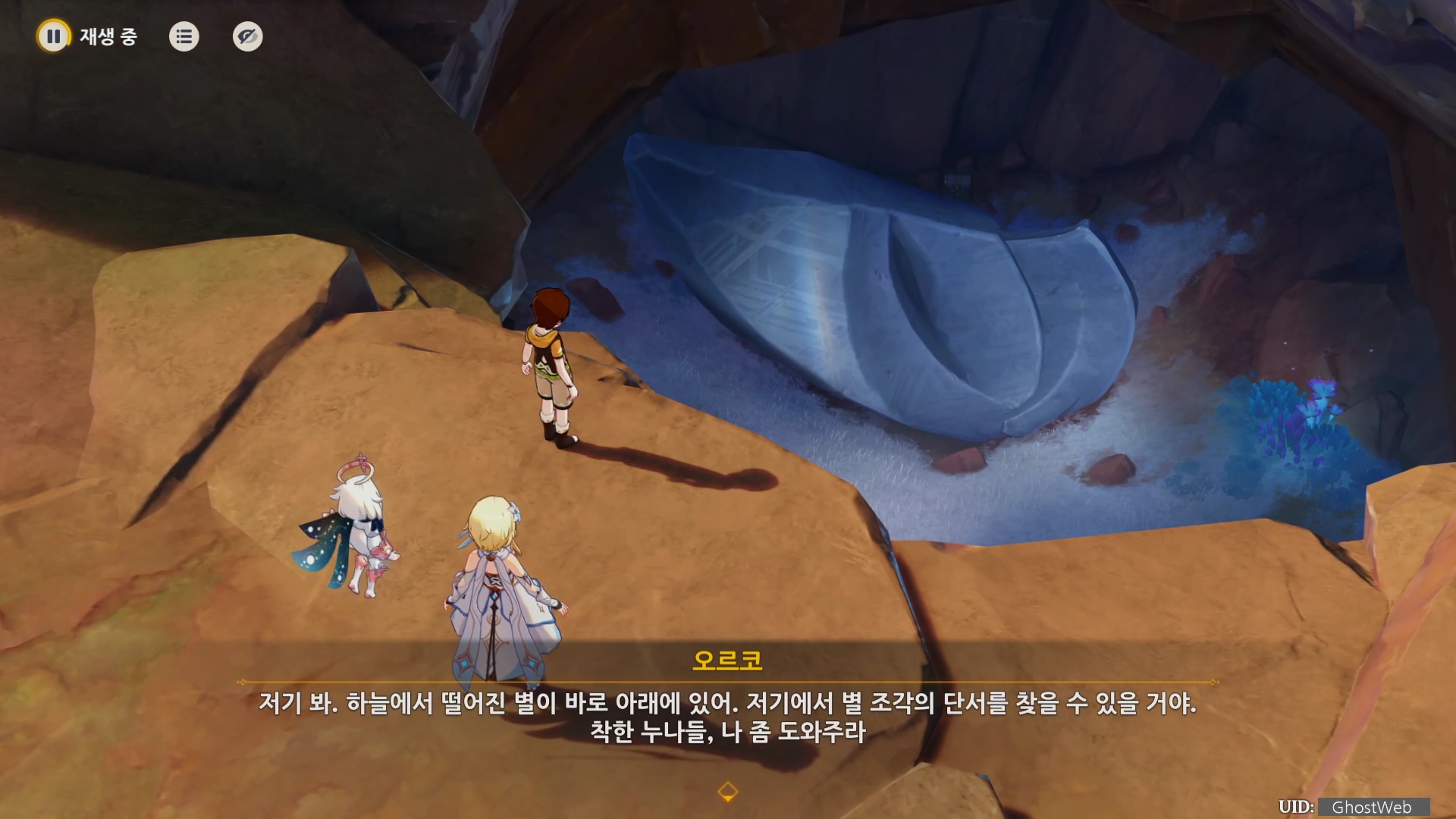 아래 웅덩이로 내려가 산룡으로 빙의 한 다음 가운데 있는 큰 별 조각에 공격을 가하면 벽에 별 조각 위치가 표시되는 곳으로 가서 별 조각들을 회수하고 오르코에게 돌아가세요. (큰 조각 뒤에 보물상자)