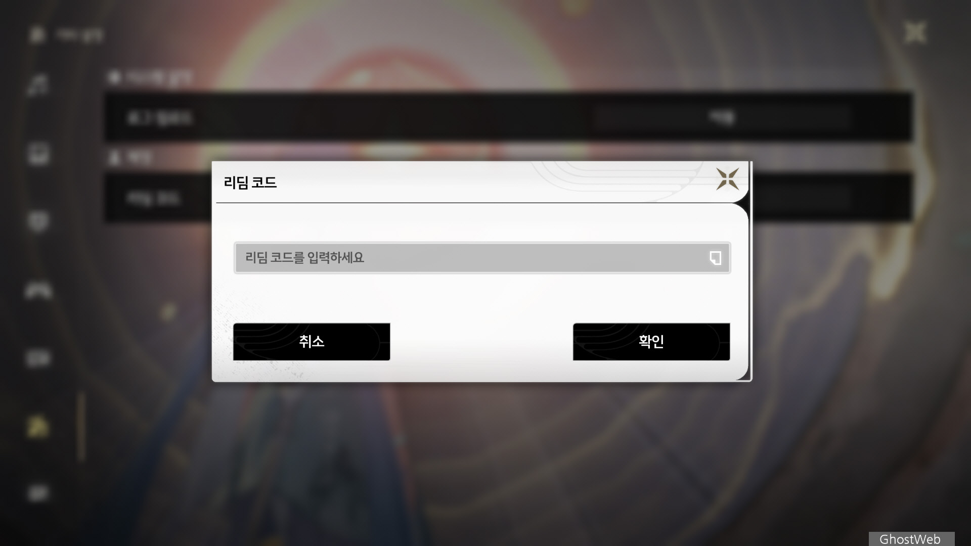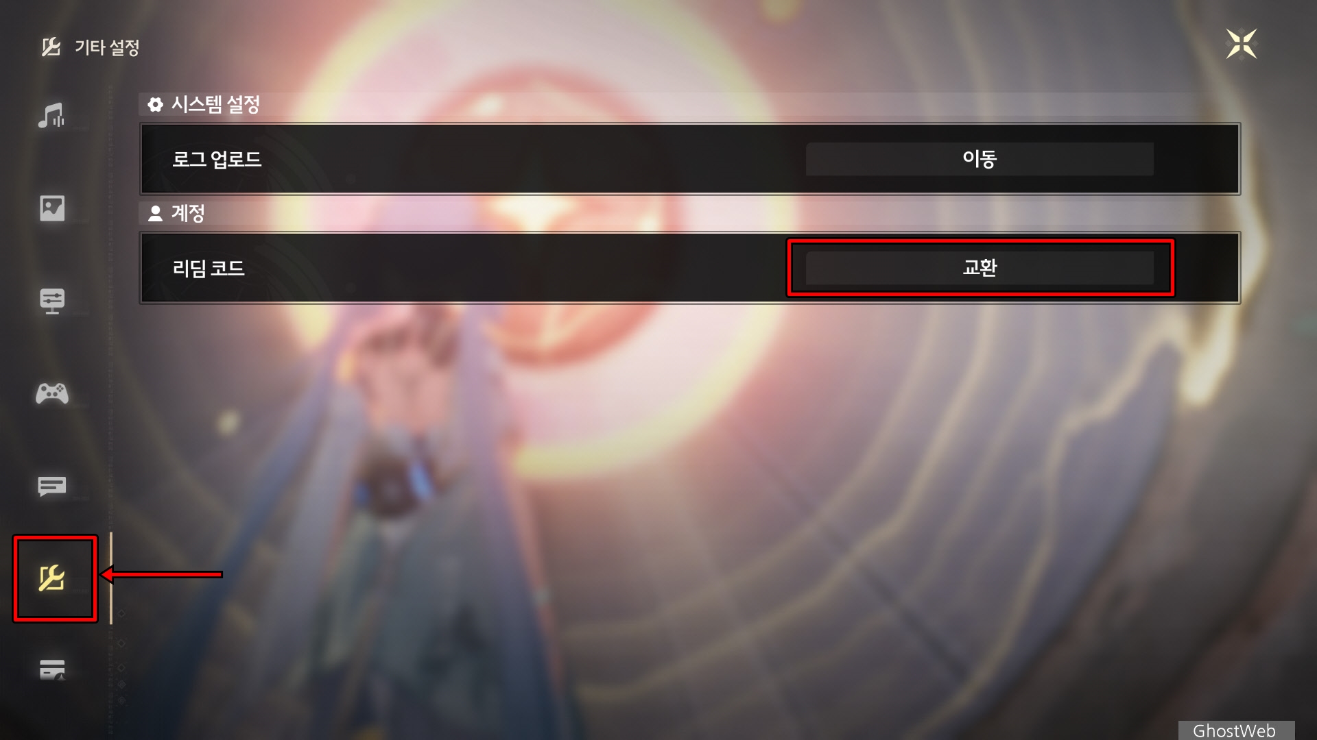 설정 창 왼쪽 메뉴에서 기타 설정 아이콘을 클릭하면 계정 - 리딤 코드 항목이 있는데 오른쪽에 있는 [ 교환 ] 버튼을 클릭하세요.