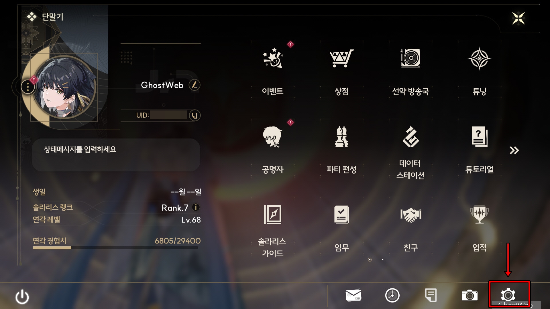 우선 단말기 창(PC : ESC키, 모바일 : 오른쪽 상단 아이콘)을 연 다음 오른쪽 하단에 있는 톱니바퀴 아이콘을 클릭하여 설정 창을 여세요.