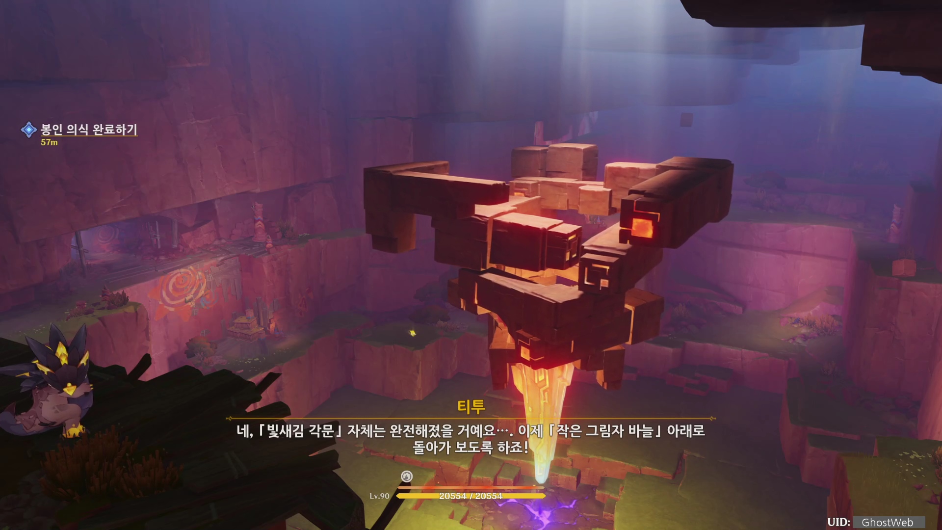 티투는 여행자에게 방금 한 것 처럼 작은 그림자 바늘를 눌러달라는 부탁를 받고 더 깊은 지하로 들어가 각문을 찾아 복구하세요. (고속 활강 업적 달성)