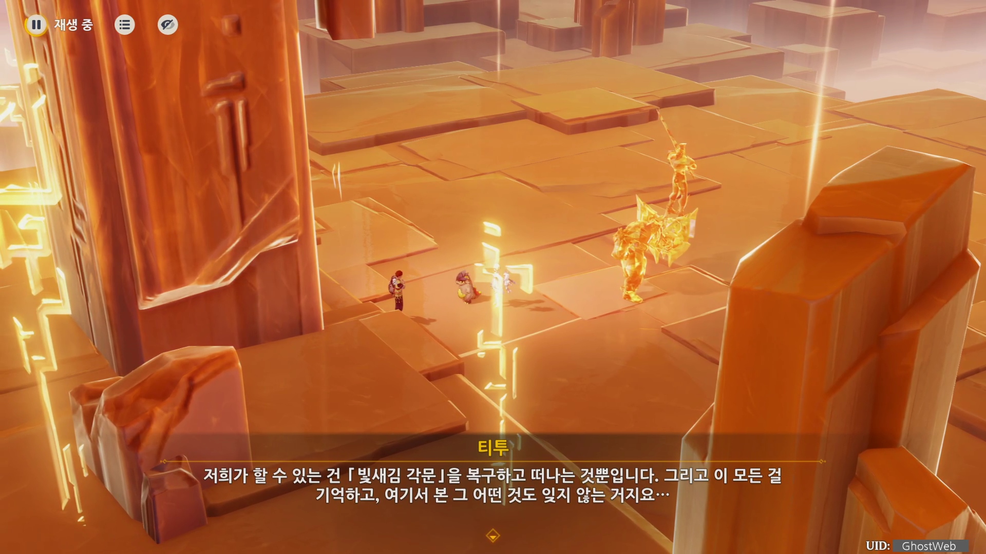 빛새김 각문을 따라 더 안으로 따라가면 봉인된 켄리아 병사인 스바니야, 엘르아살이 서 있는데 이들 뒤에 있는 각문을 만지면 진동 후 여행자는 각문의 파편을 찾으며 적들을 처치해요. (카치나 쌩쌩이, 대검 캐릭터로 총 3개 파괴)