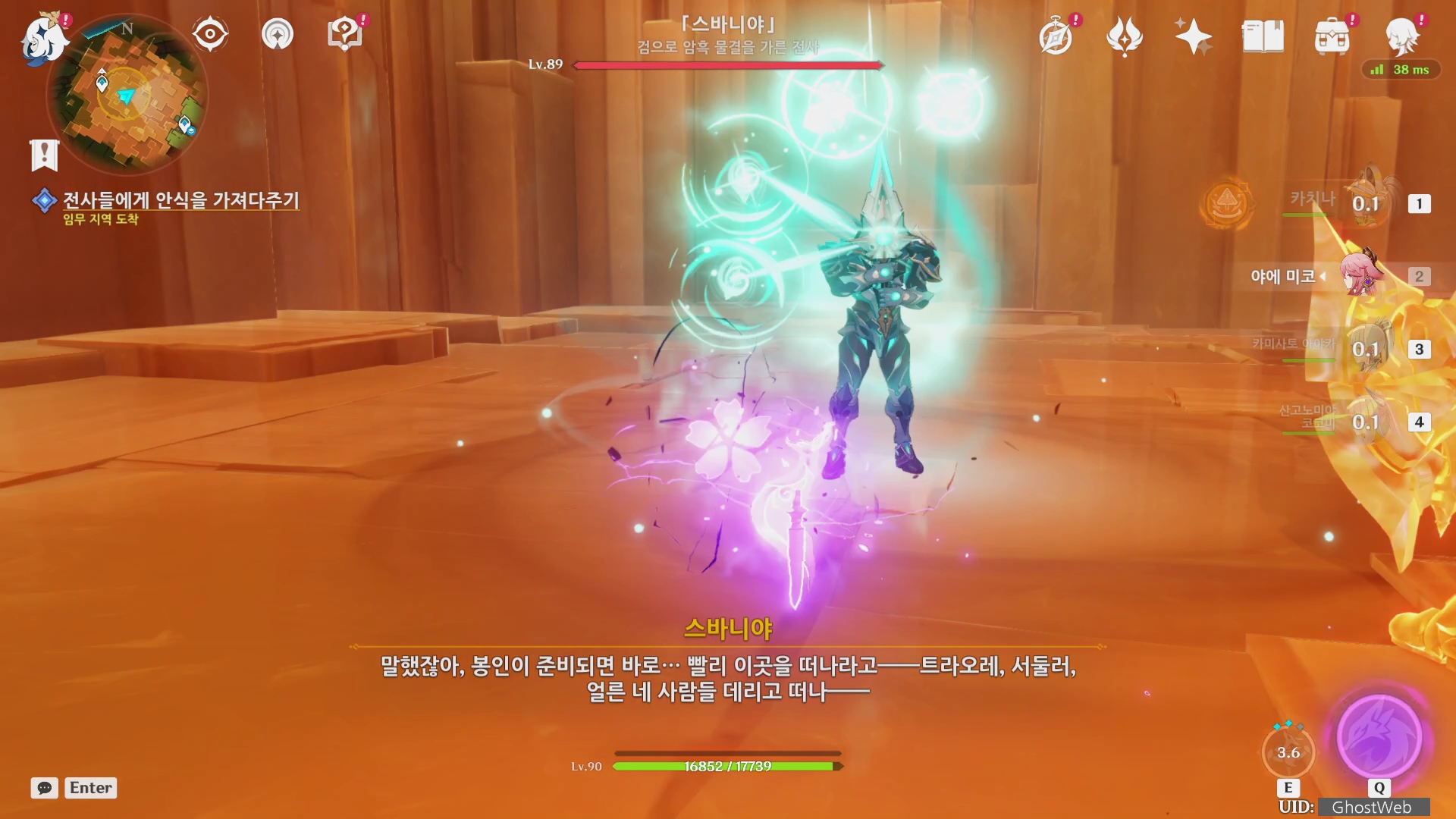 스바니야, 엘르아살을 처치하면 여행자와 페이몬은 갑자기 다른 지역으로 이동되는데 밤빛 동물을 만나 대화를 하게되는데 여행자에게 위험한 부추김과 음험한 자의 계획을 조심하라고 하라고 하며 다시 원래 있던 지역으로 보내줘요.