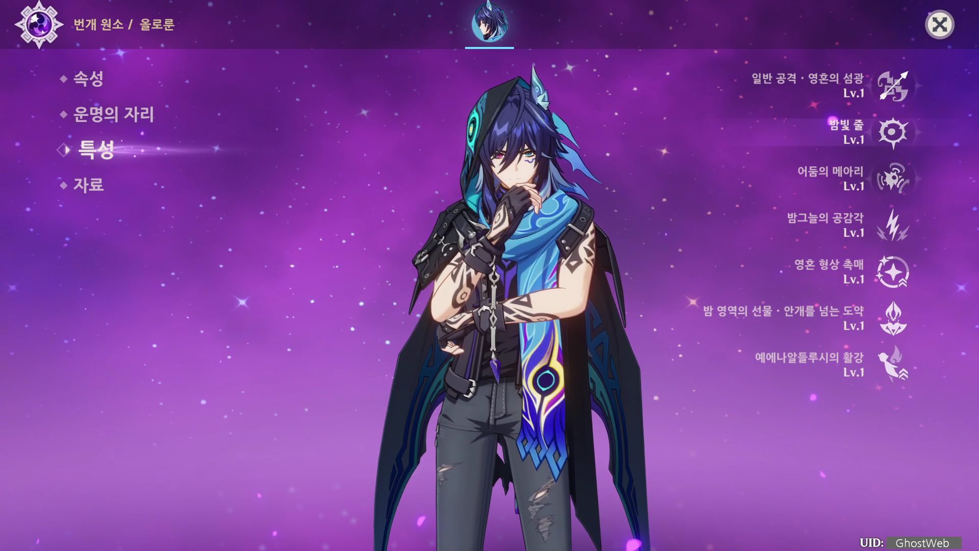 - 원소전투 스킬 발동 후 15초 동안, 파티 내에 있는 다른 캐릭터의 물 원소 또는 번개 원소 타입 공격이 적에게 명중 시, 올로룬이 밤혼을 5pt 획득한다.