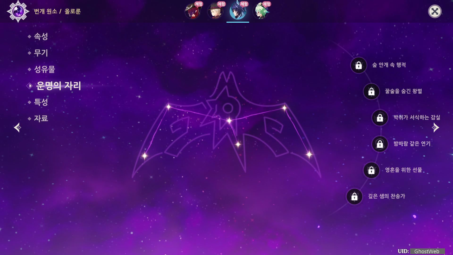 - 고유 특성 [밤그늘의 공감각]의 [현상 초감각] 발동 후, 파티 내 자신의 현재 필드 위 캐릭터의 공격력이 10% 증가한다.
