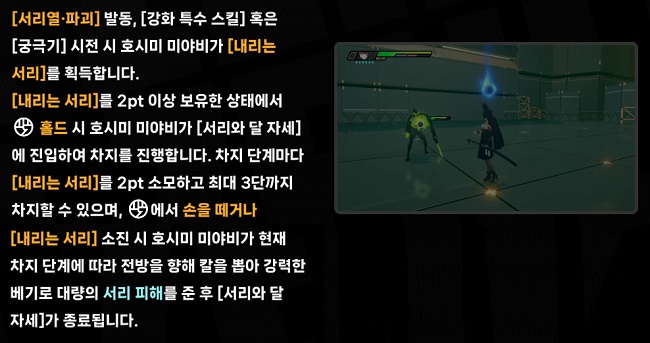 - 호시미 미야비가 칼을 거두고 [서리와 달 자세]에 진입하며 차지를 시작한다.