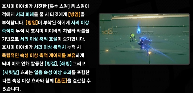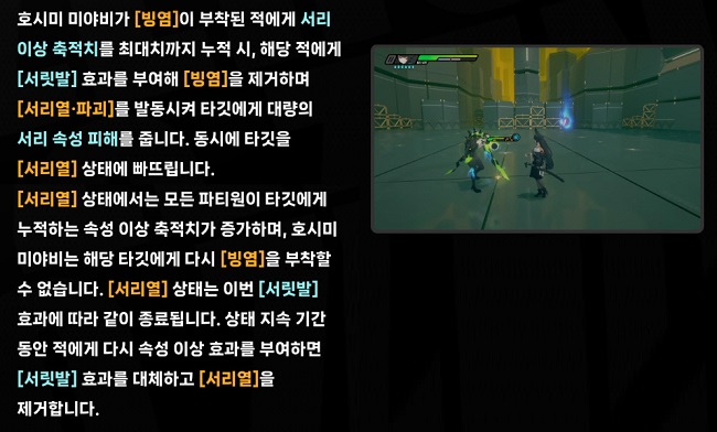 - [서리열] 상태에서는 모든 파티원이 해당 타깃에게 누적하는 속성 이상 축적치가 14% 증가하며, 호시미 미야비는 해당 타깃에게 다시 [빙염]을 부착할 수 없다.