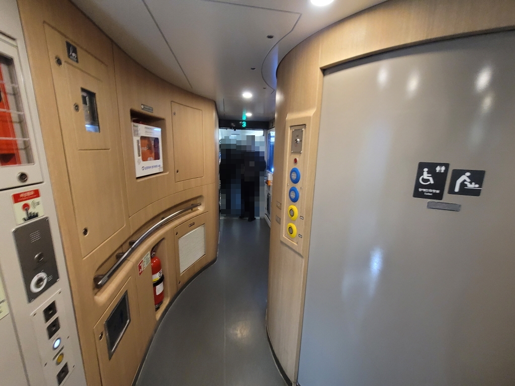 객차와 객차 사이 연결부에는 화장실과 자판기가 있으며 객차 끝 편에는 캐리어, 짐 등을 보관할 수 있는 트레이가 있어요.