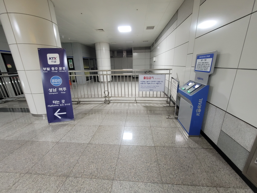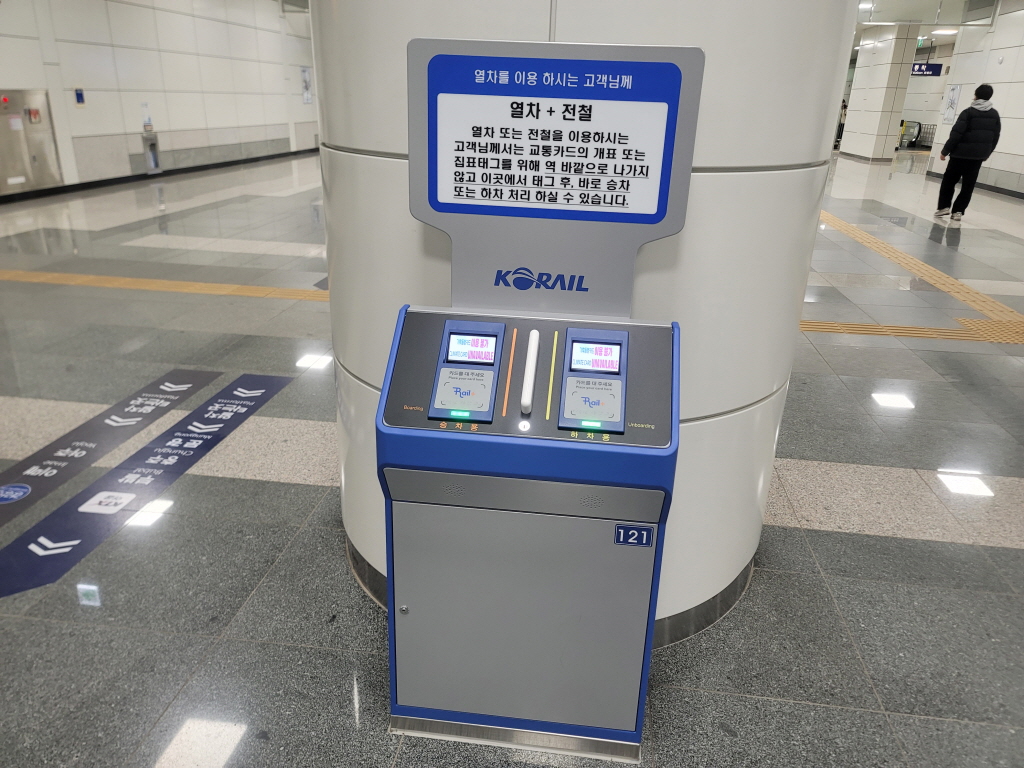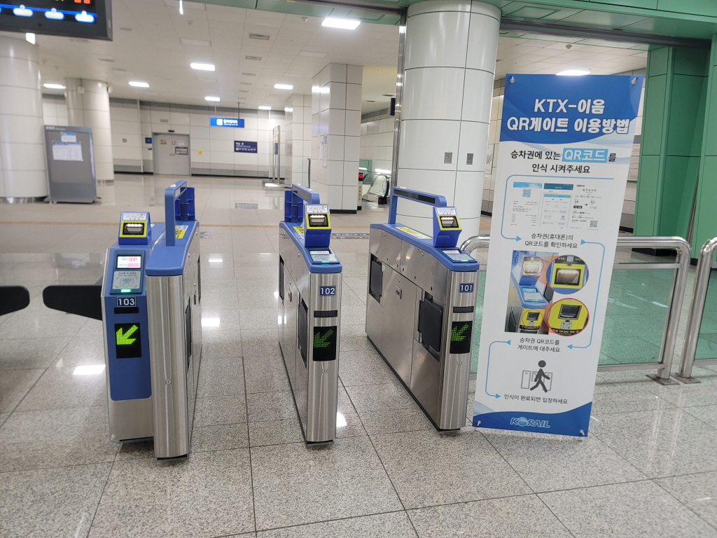 만약에 화장실을 가시기 위해 개찰구에서 교통 카드를 태그하셔서 다시 승강장으로 들어오셔야 되는 분들은 개찰구에 있는 QR 코드 인식기에 승차표 QR 코드를 인식 시키면 다시 들어갈 수 있어요. (코레일 톡 승차표도 가능)