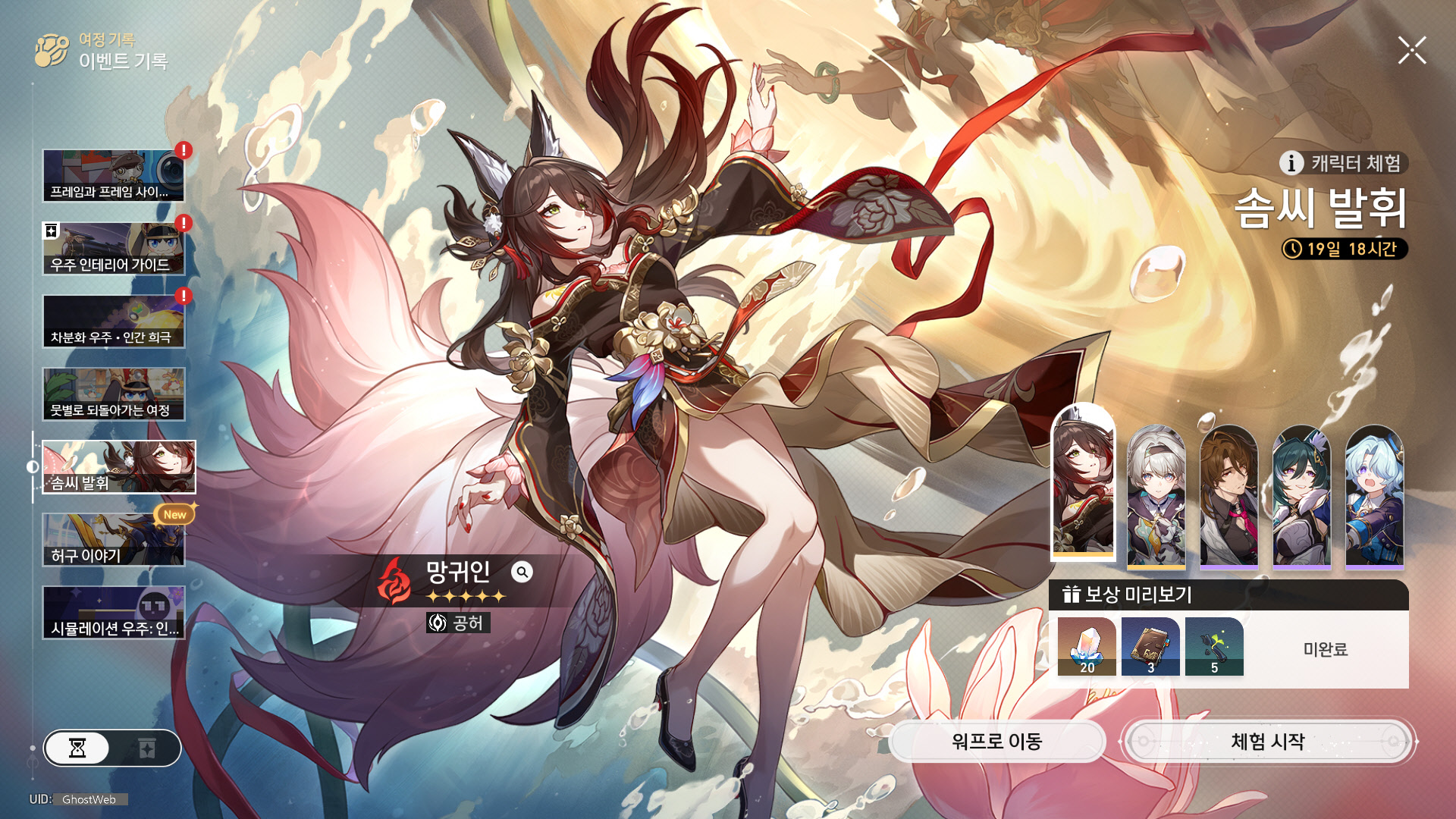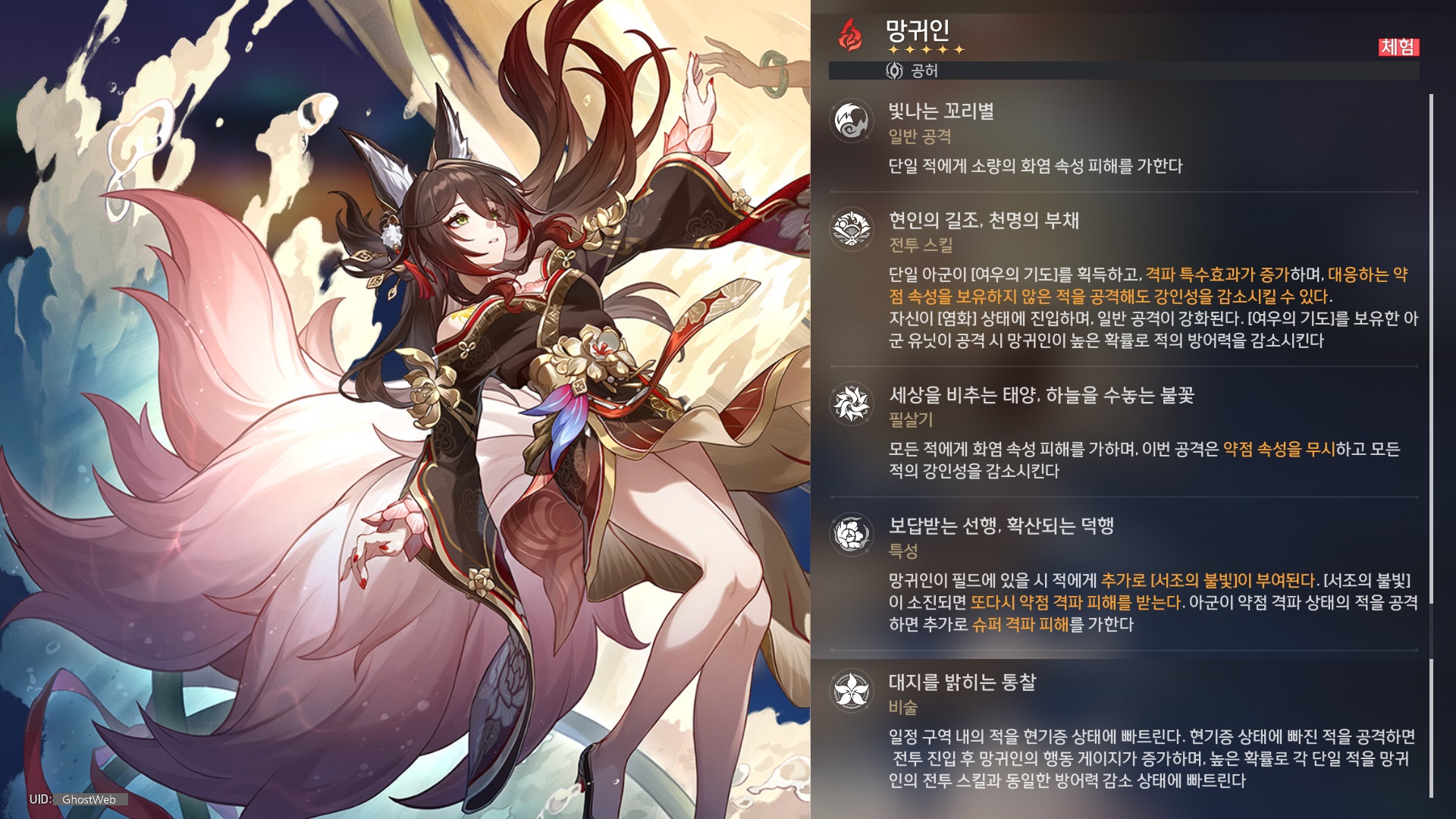| 6 | 예지된 미래, 밝혀진 성쇠 | 망귀인의 약점 격파 효율이 50% 증가한다. 망귀인이 [염화] 상태일 시 [여우의 기도] 효과가 모든 아군에게 적용된다. |