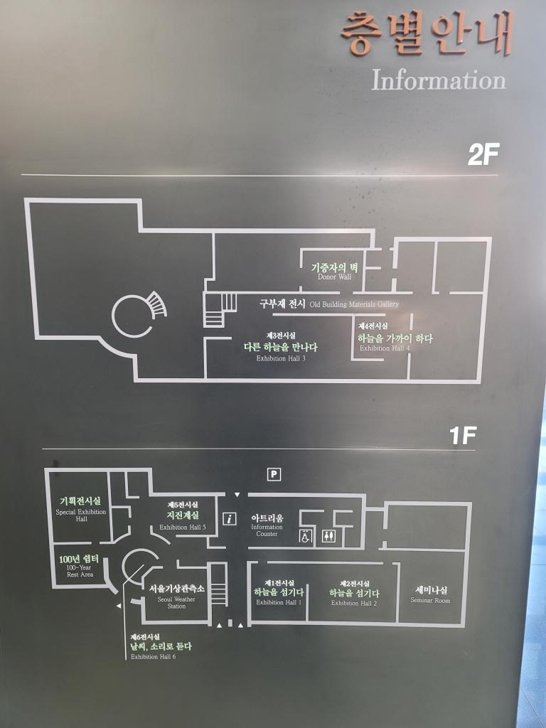1층에는 안내 창구, 화장실, 안내소, 측우기, 도서관, 예전에 사용되던 지진계실 구조를 볼 수 있으며 안내 창구에서 안내 인쇄물을 가지고 박물관을 둘러 보면 더 자세한 정보를 알 수 있어요.