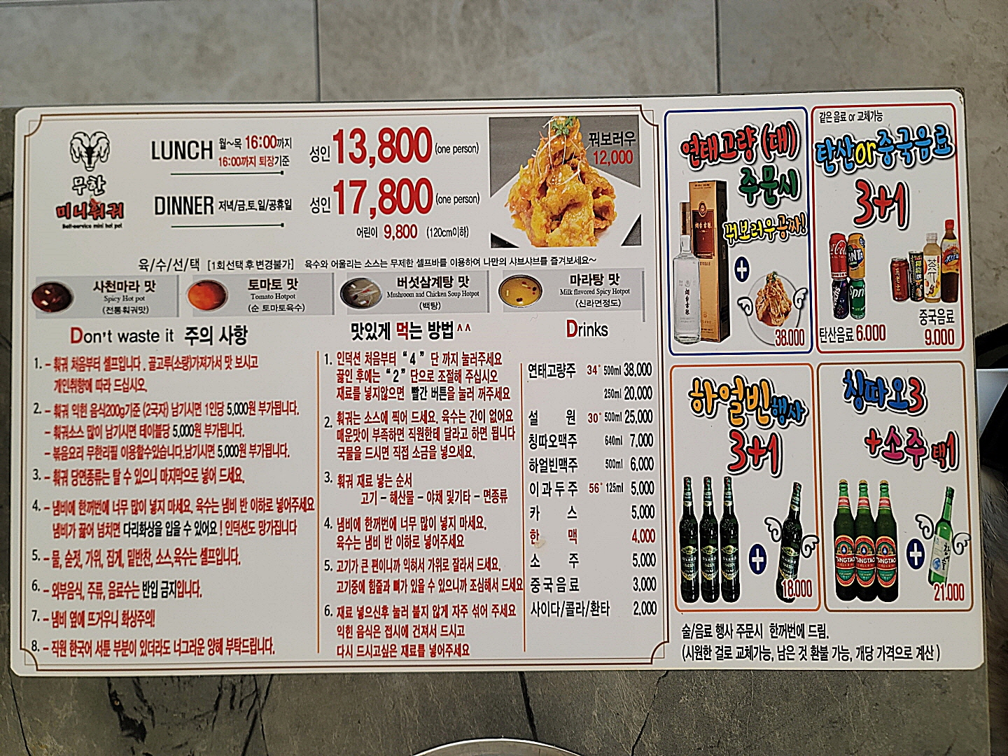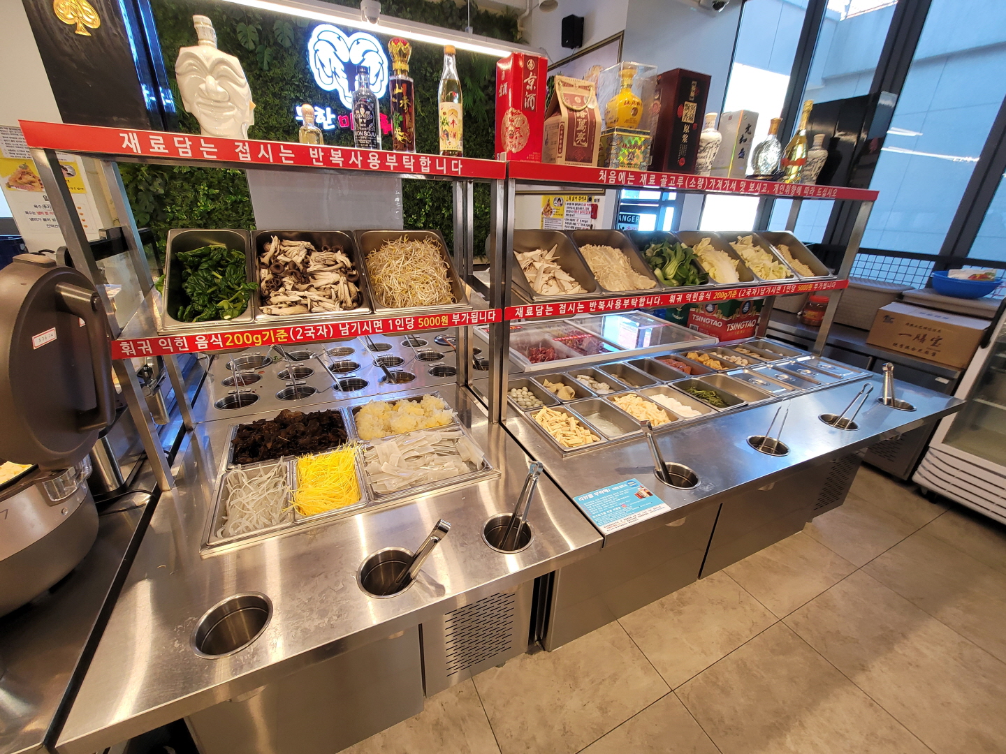 성인 가격은 월~목 런치 기준 13,800원 디너 17,800원으로 아주 부담스러운 가격은 아니며, 자리에 앉으면 사천마라, 토마토 맛, 버섯삼계탕, 마라탕 맛이 중 고른 다음 가게 한편에 있는 음식 칸으로 가세요. (계산 후불)
