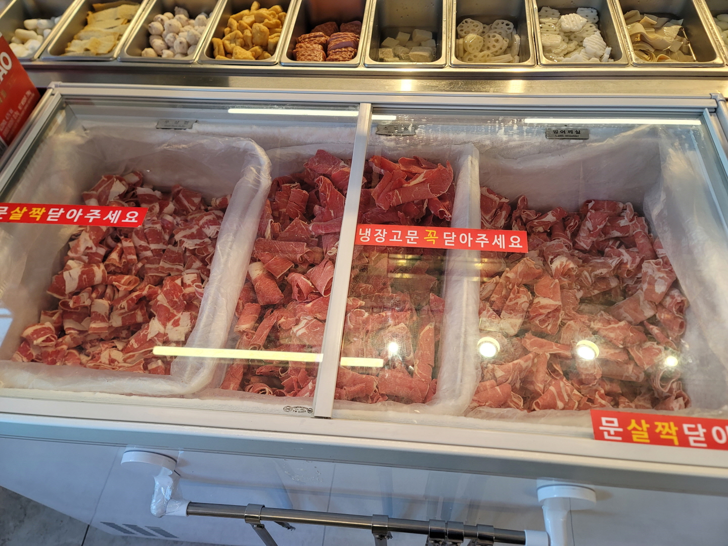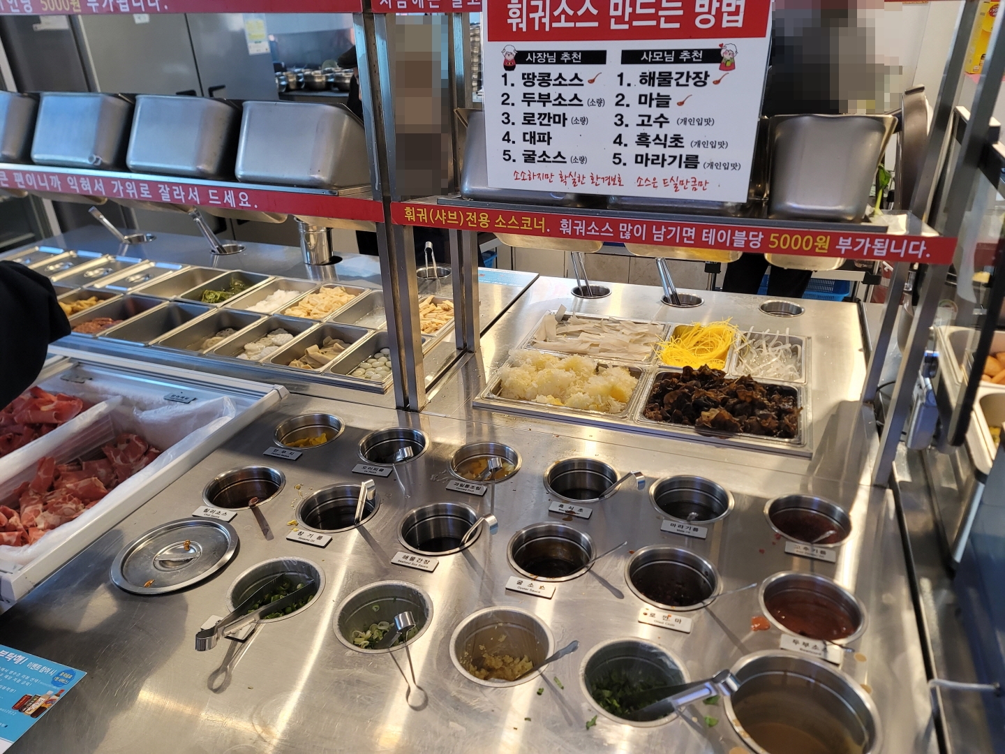 고기는 냉동으로 우삼겹, 소등심, 양어깨살 3종류를 먹어 볼 수 있으며, 옆에는 많은 소스들이 있어서 취향대로 소스를 만들 수 있어요.