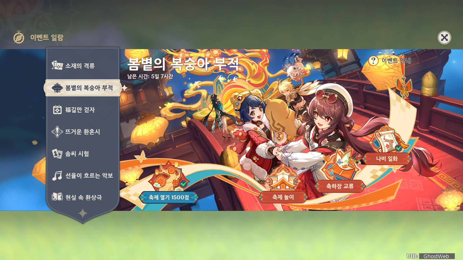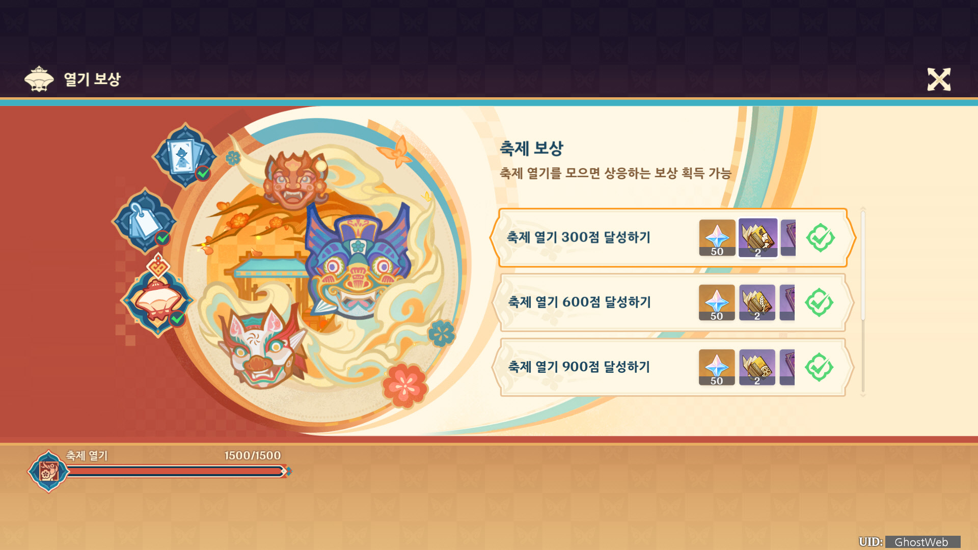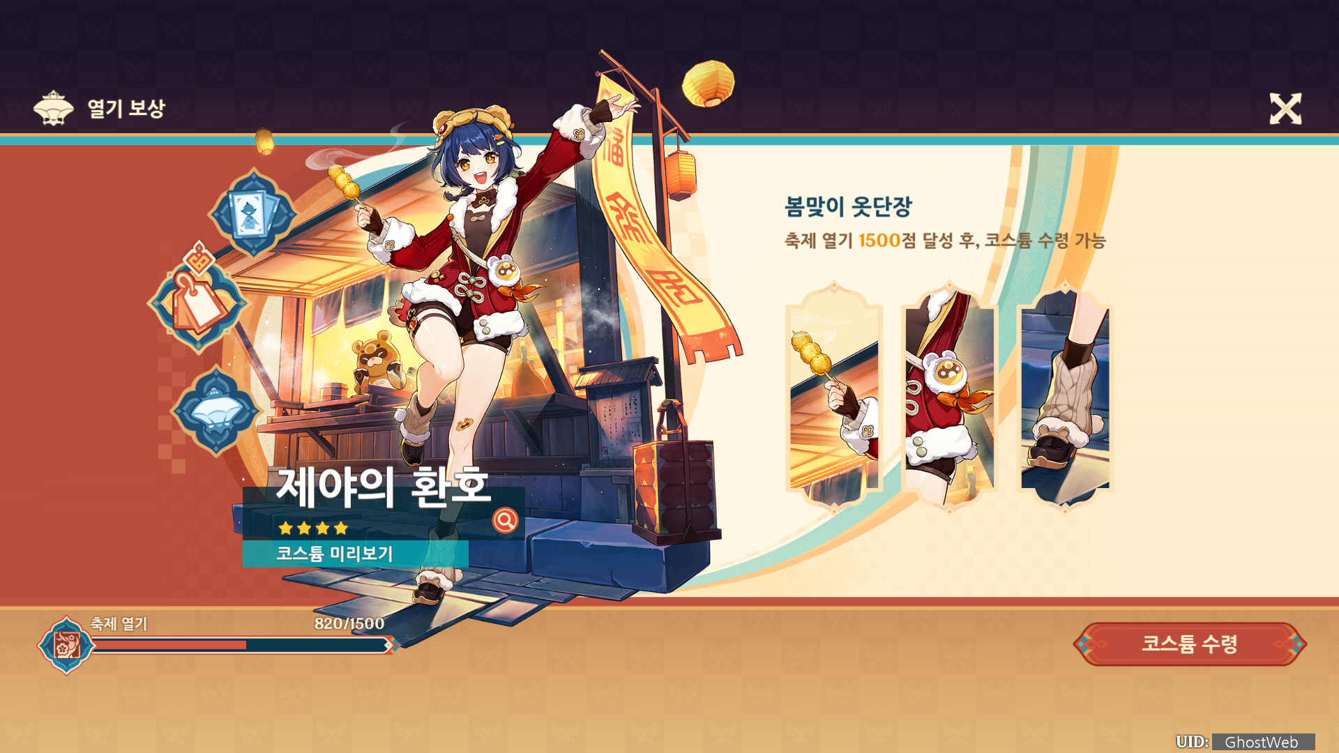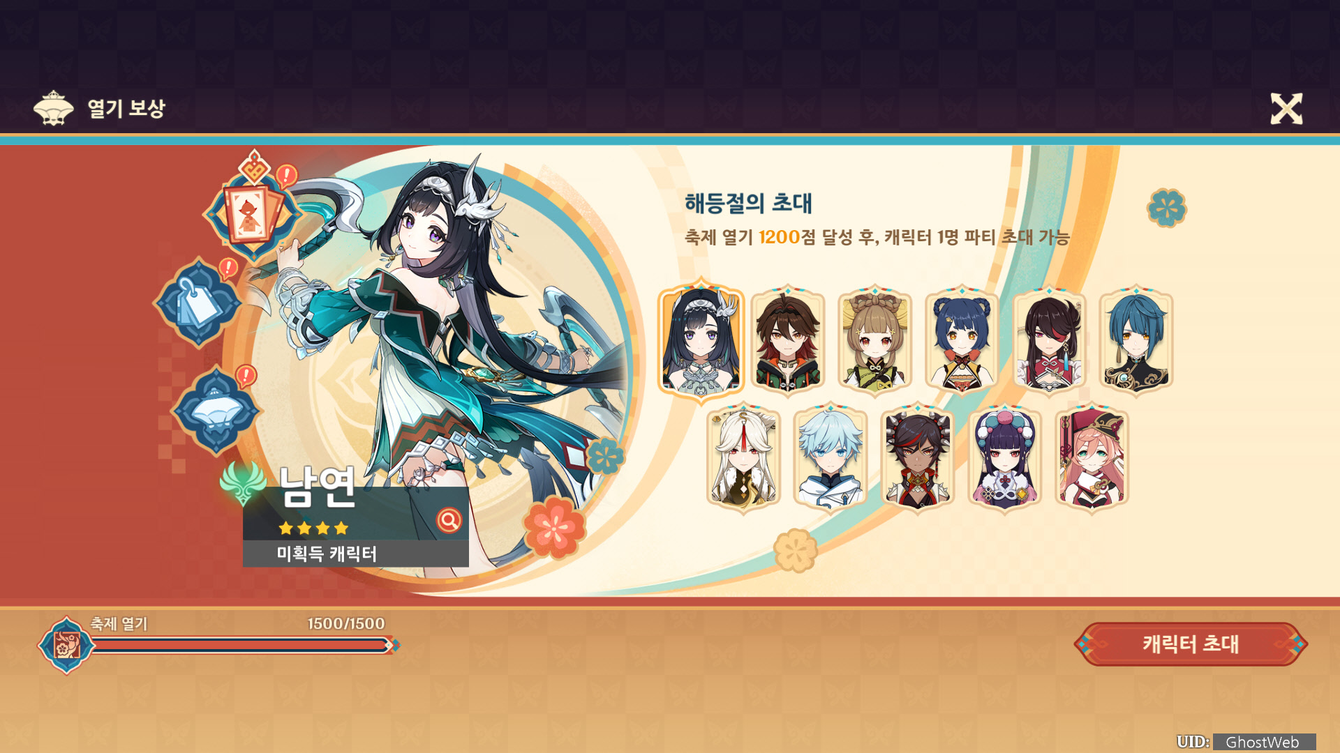 각 미니 게임 등에 도전하여 포인트를 모아 열기 보상에서 해등절의 초대를 통해 리월 4성 캐릭터 1명을 획득할 수 있으며, 향릉 코스튬 인 제야의 환호를 얻을 수 있어요.