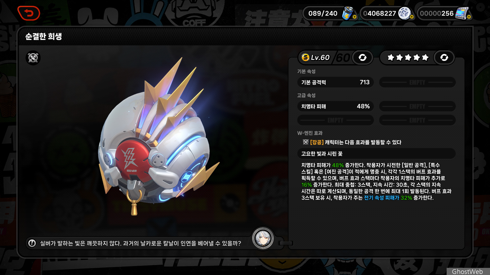 - [은빛 별] 표식이 부여된 적 유닛이 받는 [여진 공격] 치명타 피해가 0호·엔비 치명타 피해의 17.5%만큼 추가로 증가한다.