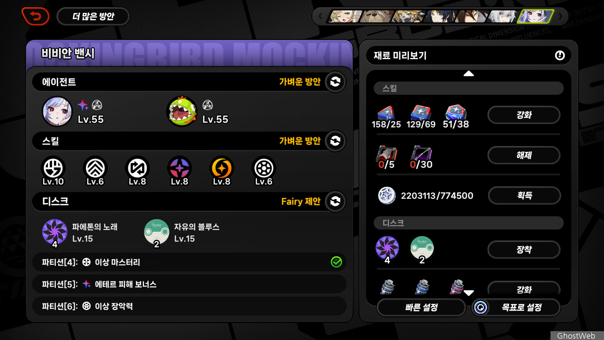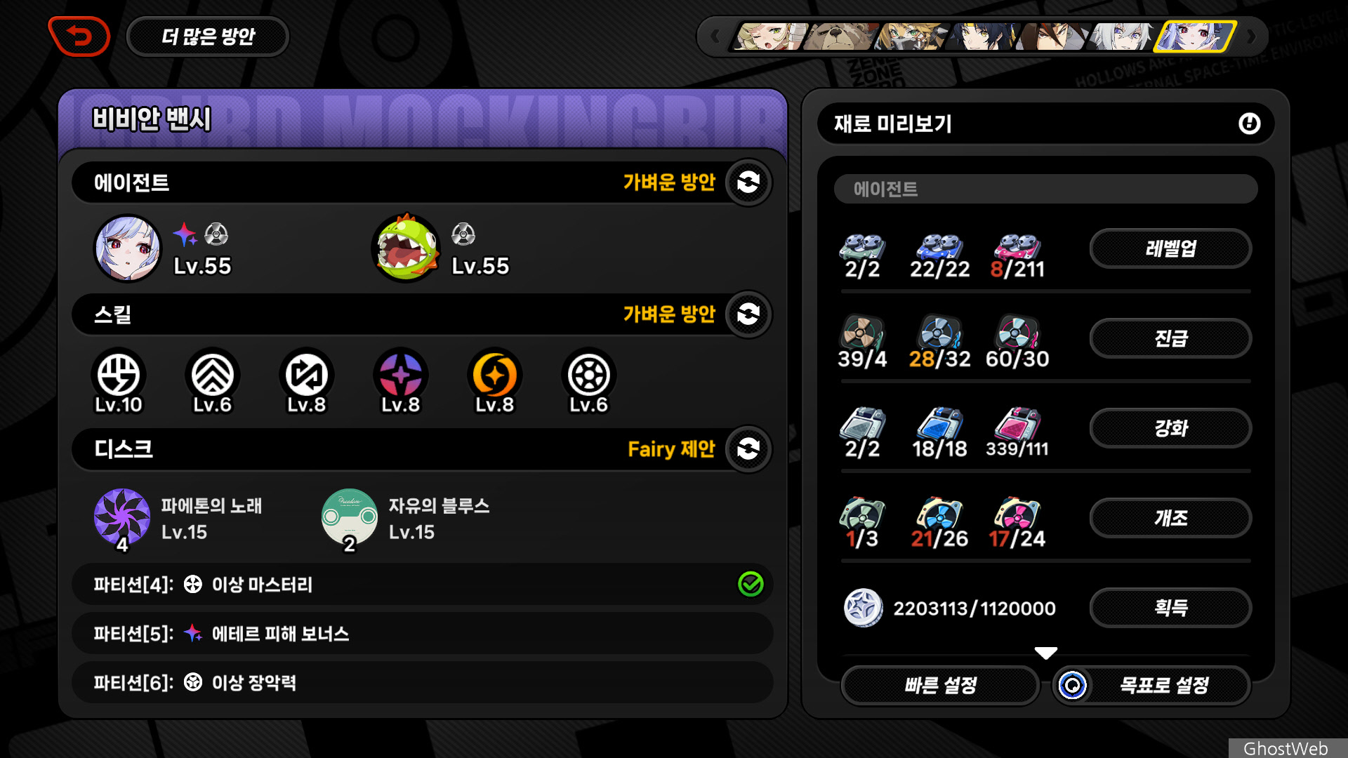 | 2 | <폭풍우의 밤, 폭풍우의 밤> | 비비안의 에테르 이상 축적 효율이 25% 증가한다. [난개]가 마스터리에 기반하여 획득하는 효과가 기존의 130%까지 증가하며 타깃의 모든 속성 피해 저항을 15% 무시한다. |