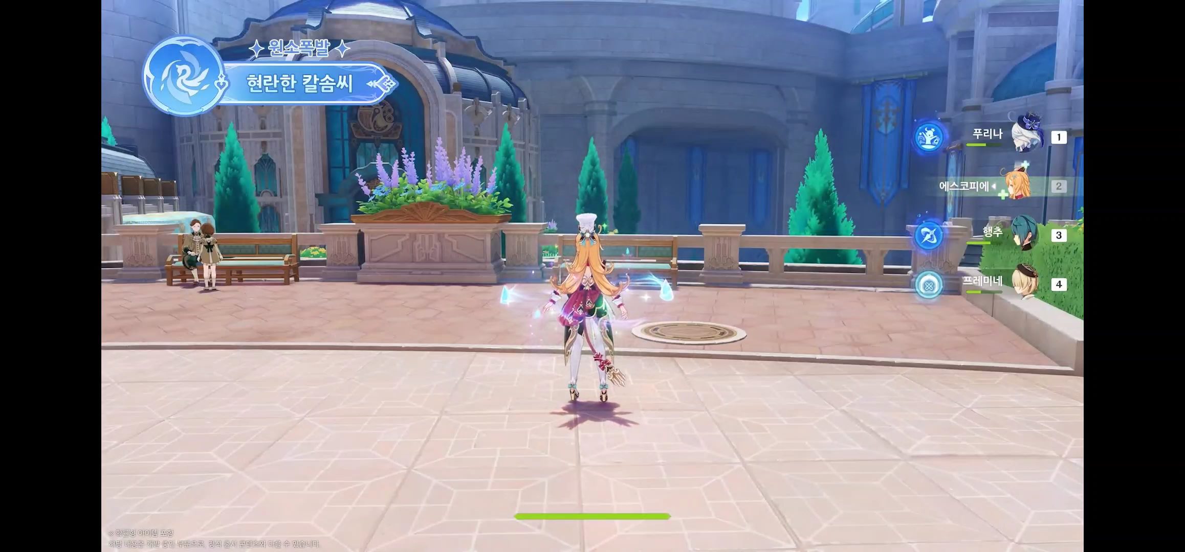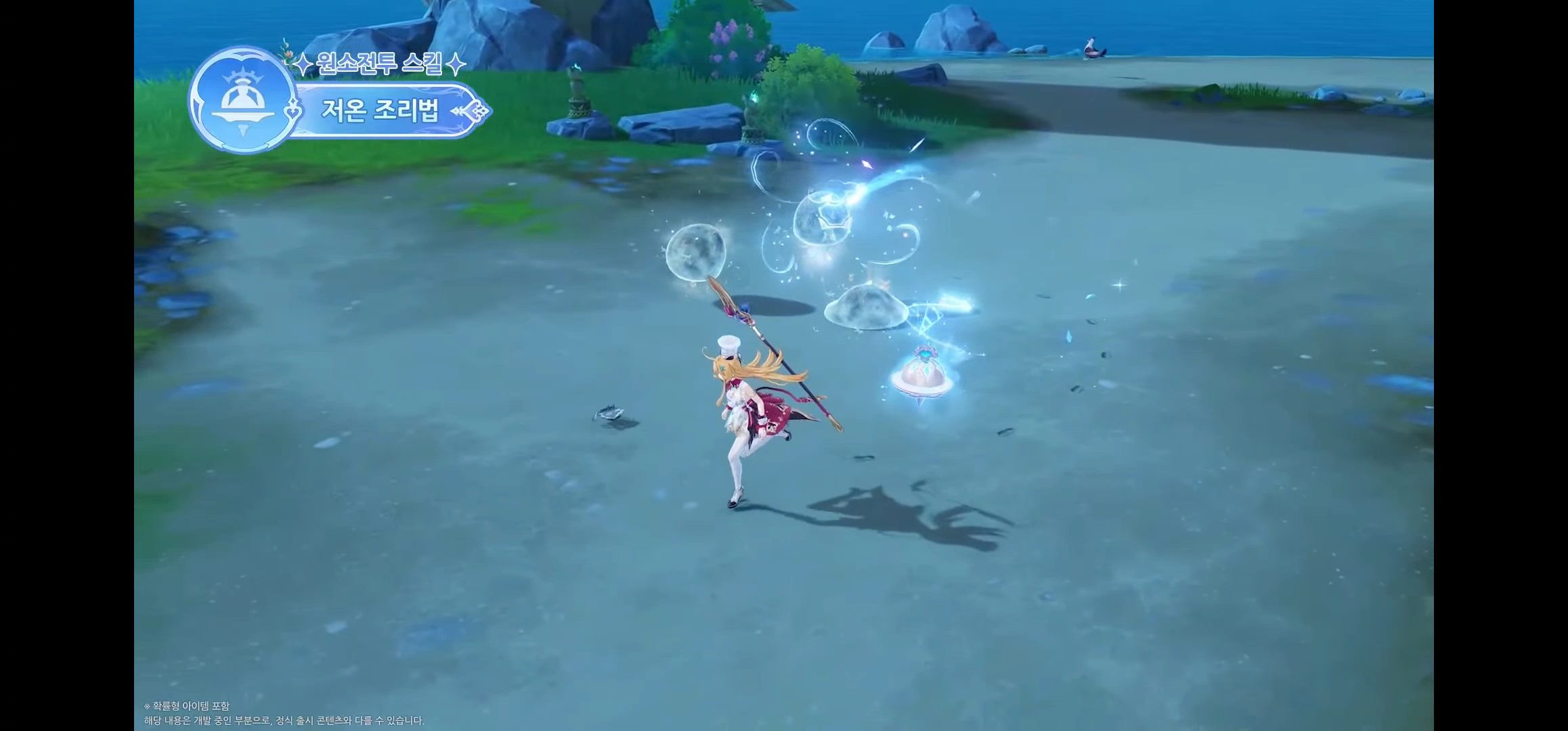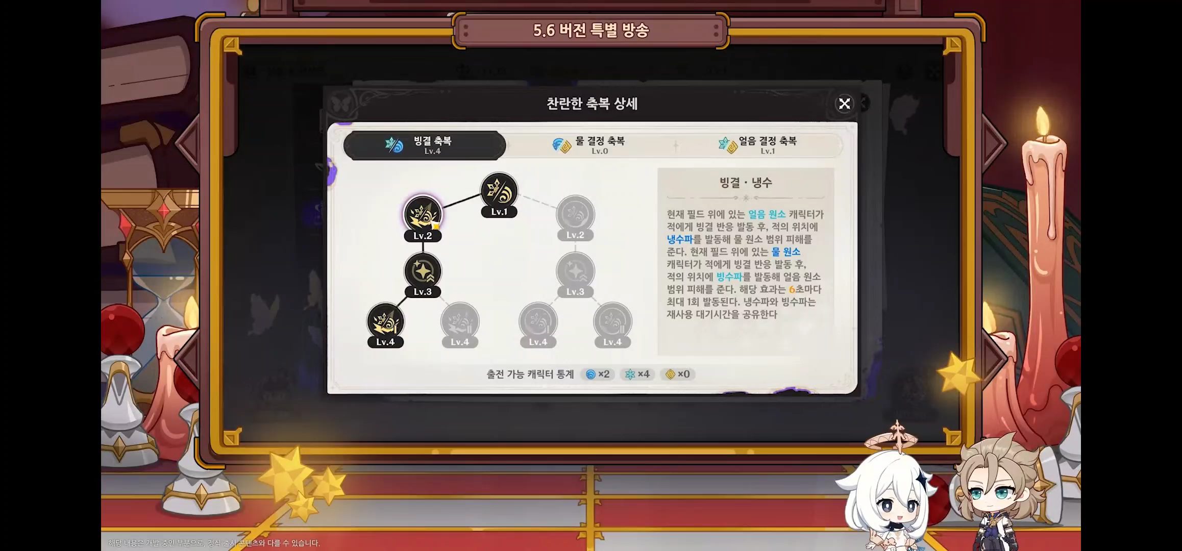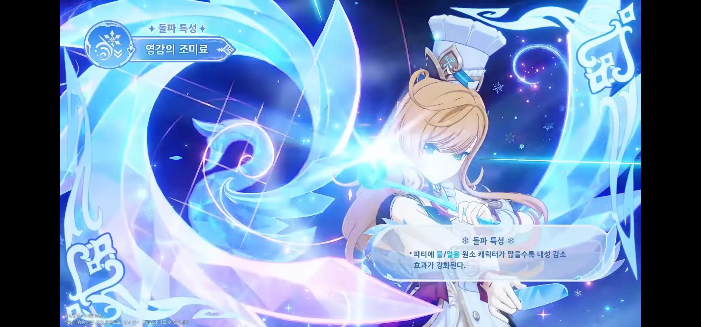 - 파티에 물/얼음 원소 캐릭터가 많을수록 내성 감소 효과가 강화된다. (보스, 빙결 효과 면역인 적에게도 영향을 줌)