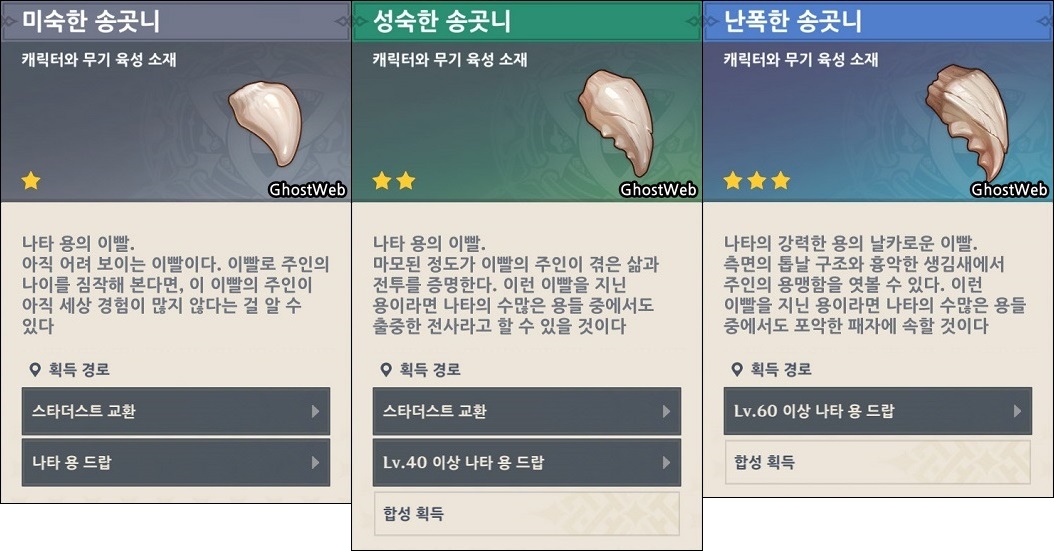 - 미숙한 송곳니, 성숙한 송곳니, 난폭한 송곳니 (나타 | 산룡, 어룡, 숲룡 처치)