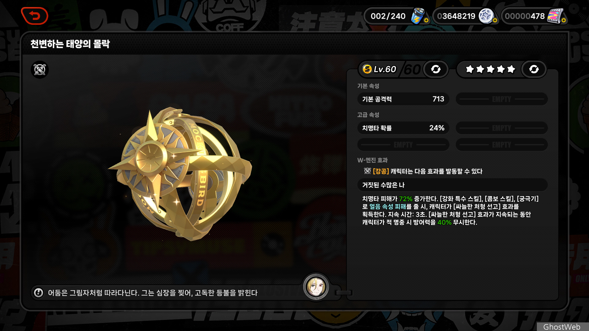 ○ 특성 : 강공 (전용 무기 : 천변하는 태양의 몰락)