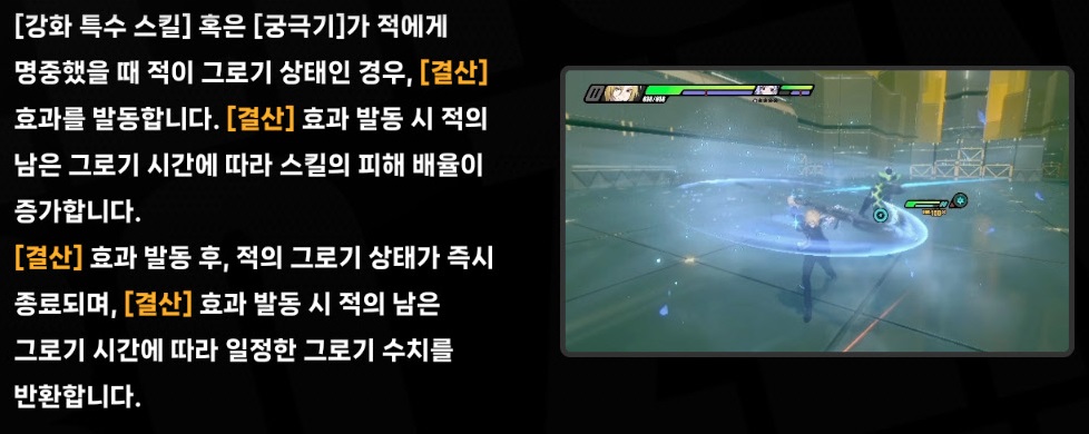 - 또한, [결산] 효과는 발동 시 적의 남은 그로기 시간에 따라 해당 스킬 피해 배율을 한층 더 증가시킨다.