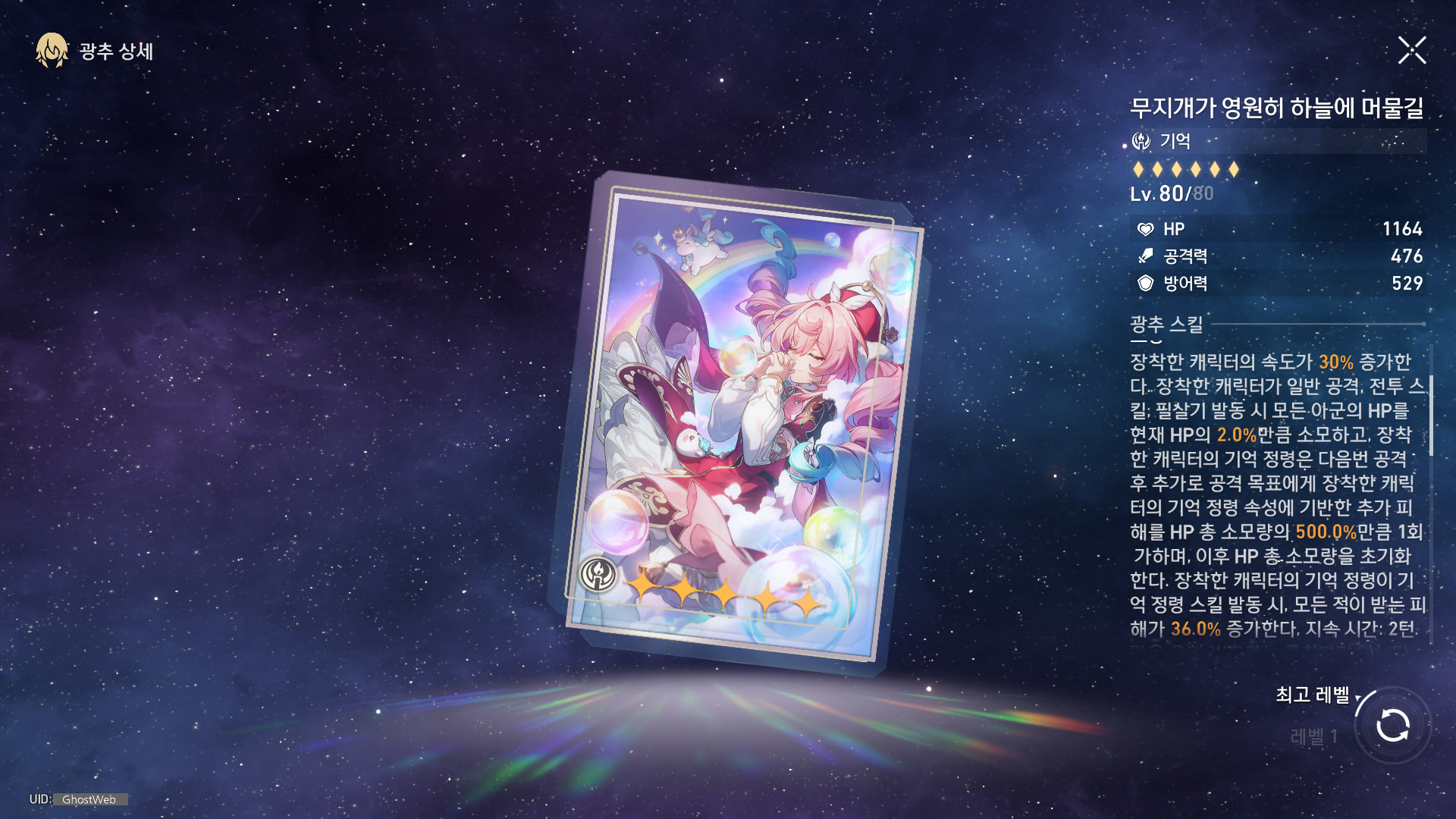 | 4 | 햇빛 호박을 그대에게 | 행적 [잔잔해진 폭풍]이 강화된다. 속도가 1pt 초과할 때마다 히아킨과 이카의 치명타 피해가 추가로 2% 증가한다. |