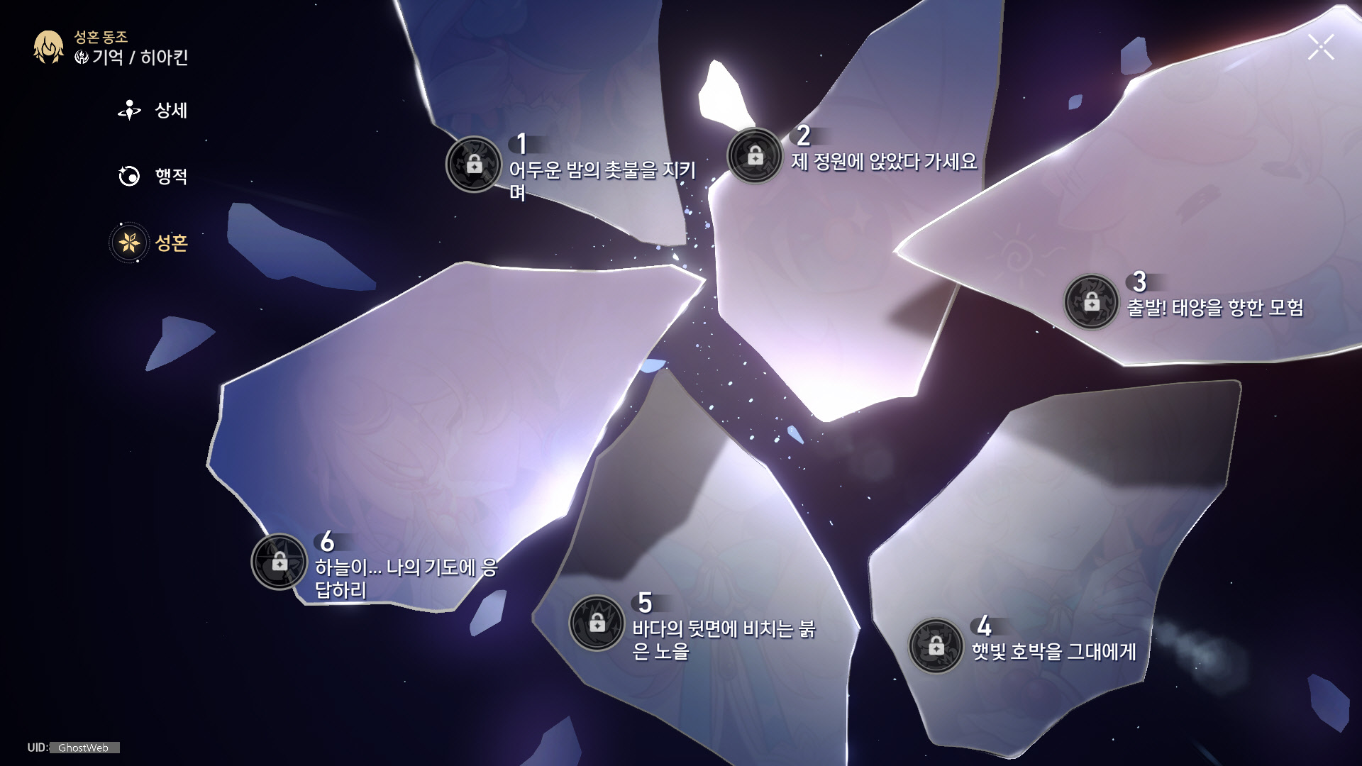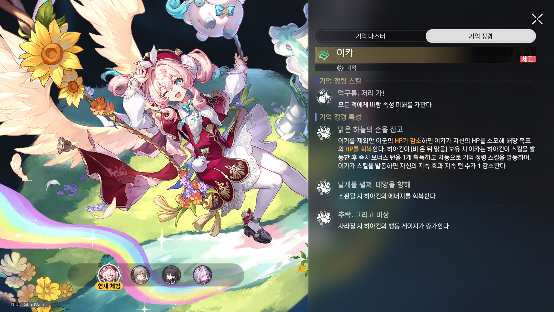 | 6 | 하늘이...나의 기도에 응답하리 | 이카가 기억 정령 스킬을 발동하고 초기화되는 누적 치유 수치가 12%로 변경된다. 이카가 필드에 있을 시 모든 아군의 모든 속성 저항 관통이 20% 증가한다. |