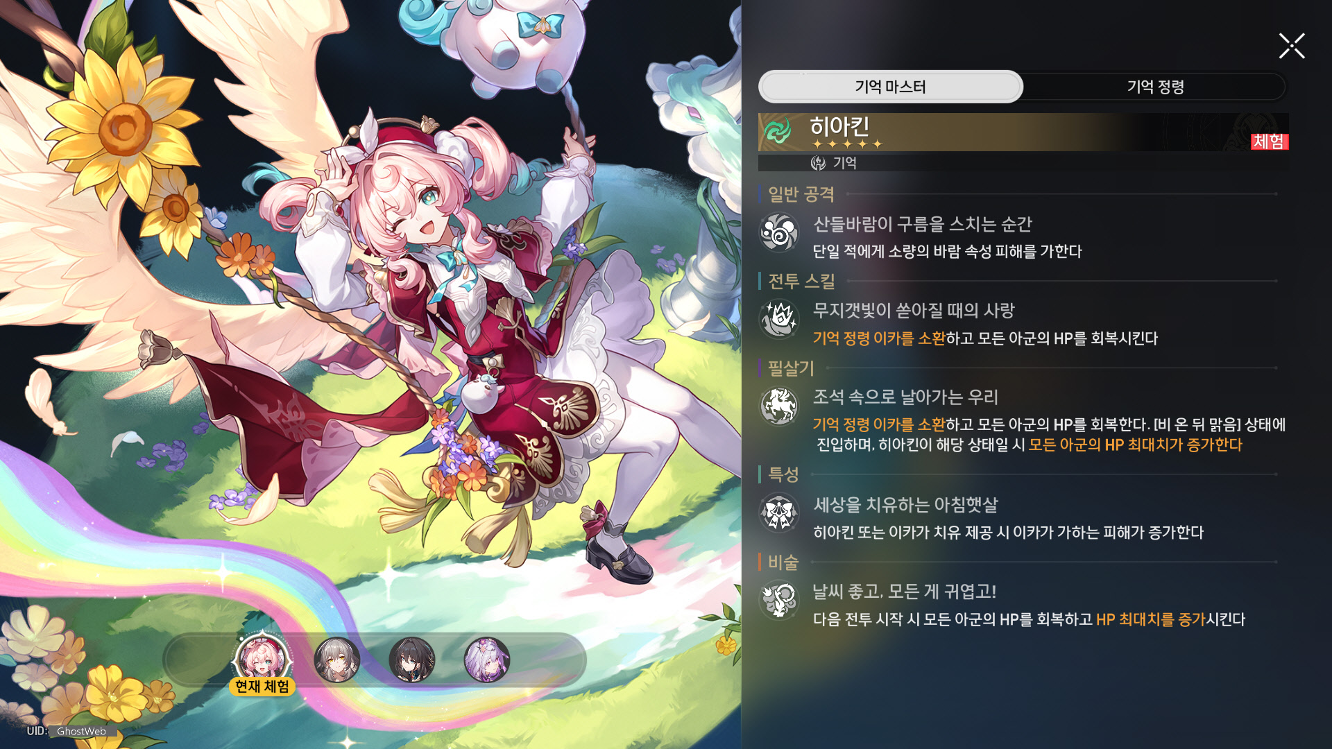 - 기억 정령 이카를 소환하며, 이카를 제외한 모든 아군의 HP를 히아킨 HP 최대치의 4% + 40만큼 회복하고, 이카의 HP를 히아킨 HP 최대치의 5% + 50만큼 회복한다.