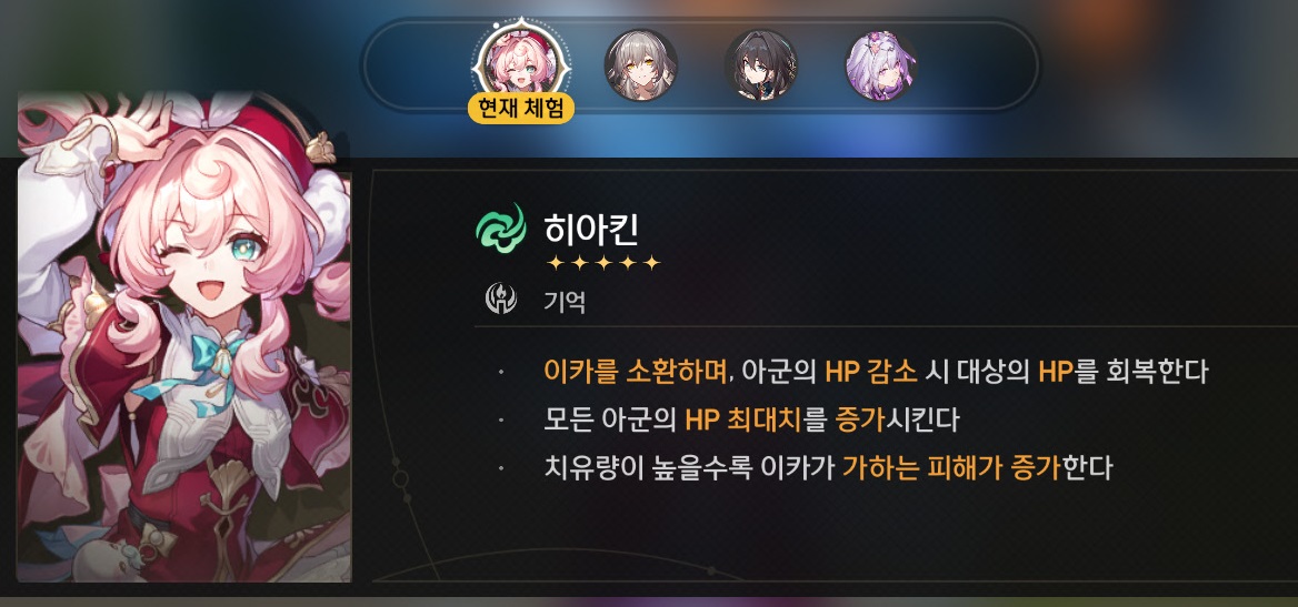 히아킨은 파티 전체 힐러로 이카를 소환하여 함께 전투에 참여하는데 이카의 공격력은 히아킨의 치유량에 영향을 받아요.