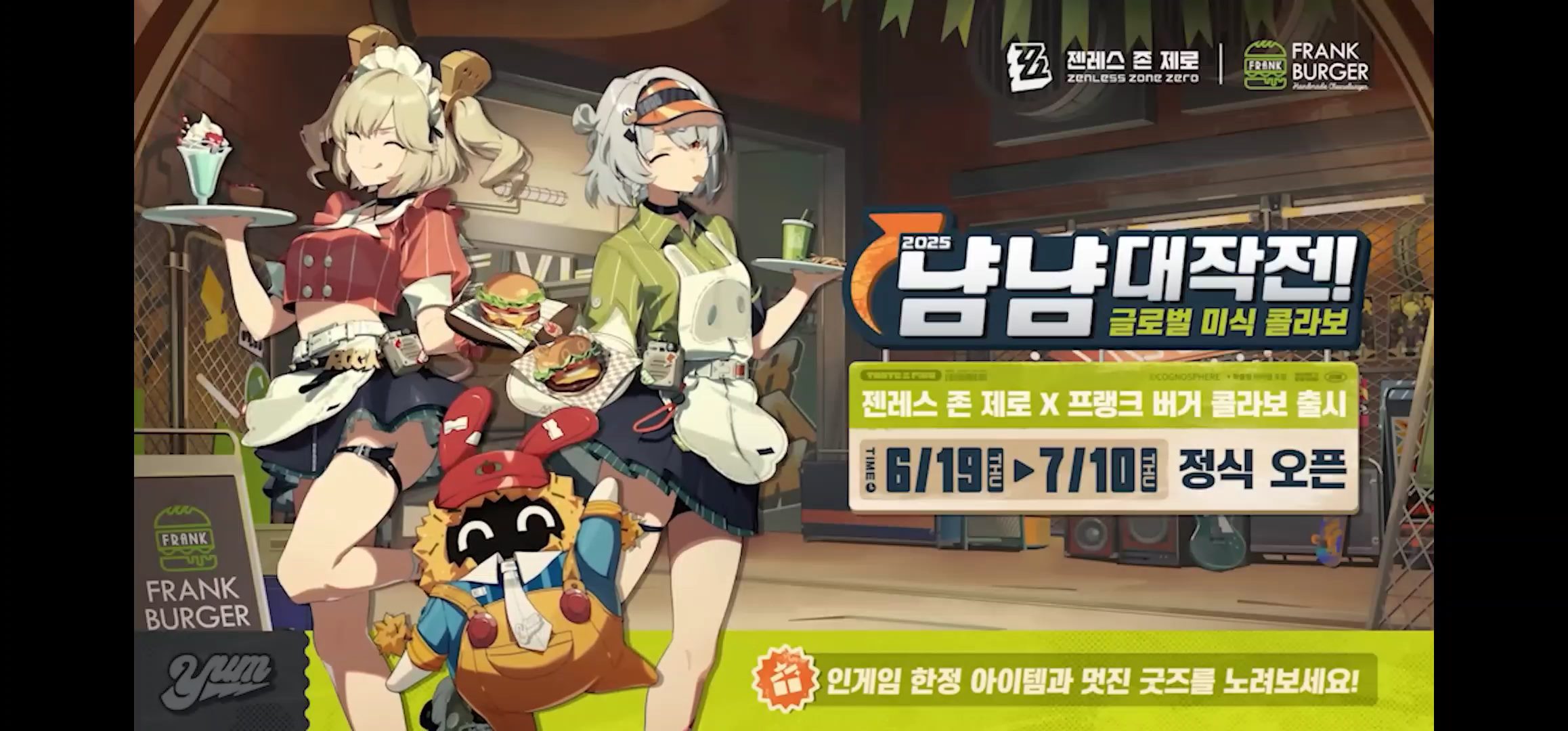 🎁 프랭크버거 콜라보 예고 PV | 젠레스 존 제로 @ZZZ_KO를 팔로우하고 본 게시물을 재게시하면 추첨을 통해 프랭크버거 1만원 쿠폰x1을 드립니다! 「리두의 맛 마이쩡? 마시쩡!」 엔비, 버니스, 그