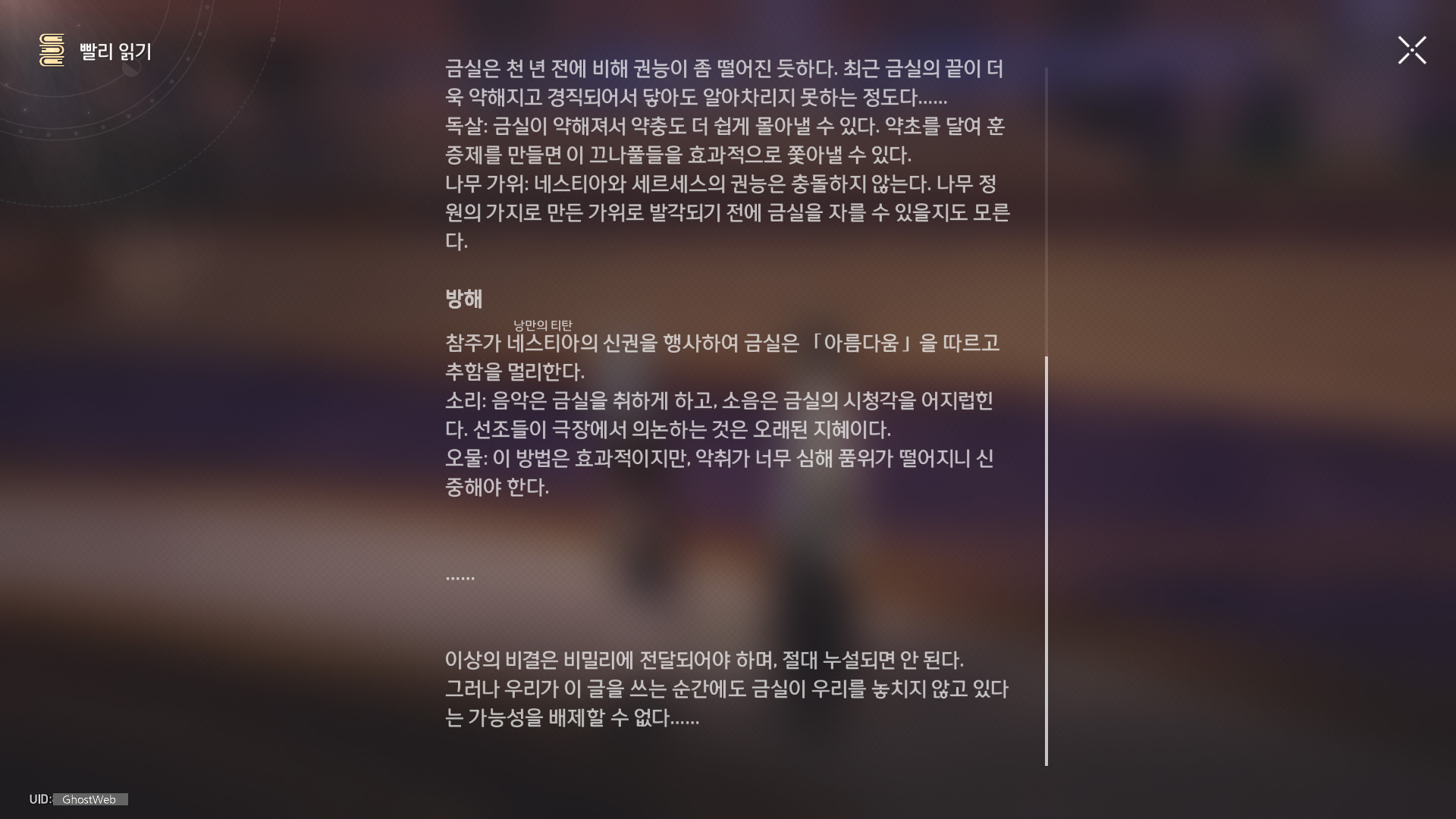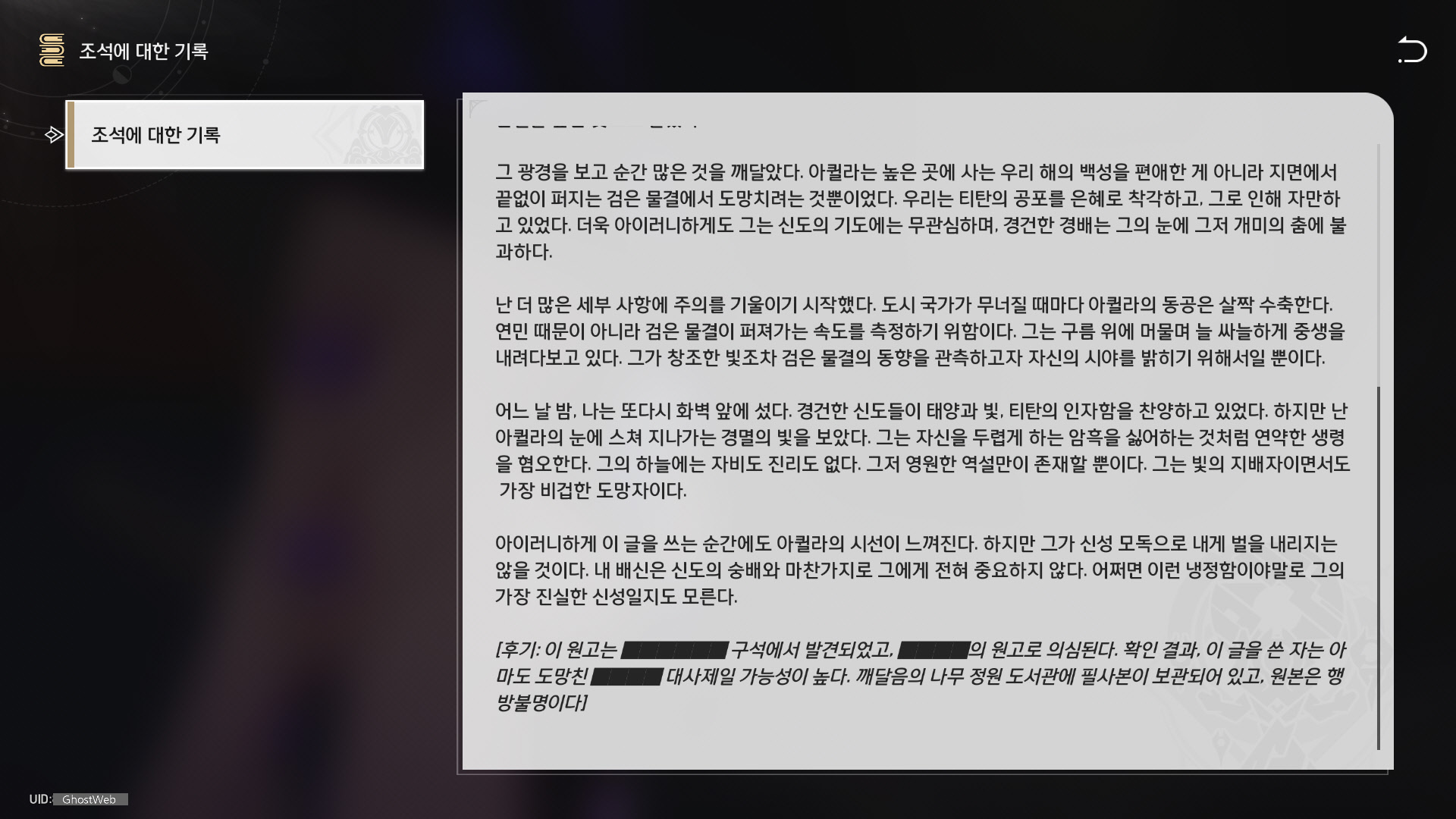 | [붕괴: 스타레일] 앰포리어스 - 몰락한 황혼의 도시 - 오크마(전리품, 약충, 서적 위치 정리) (0) | 2025.06.01 |