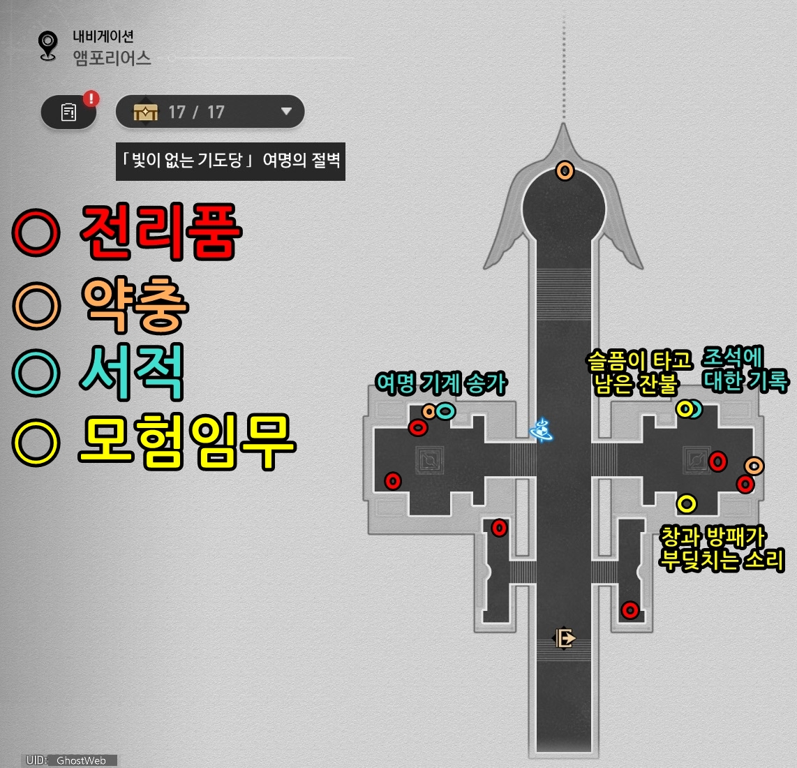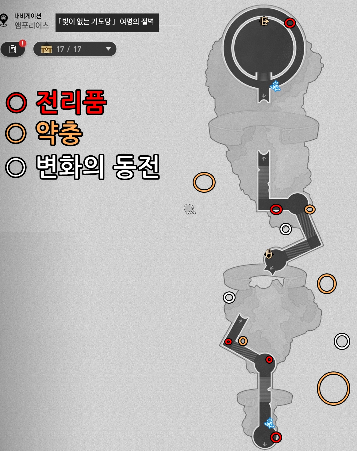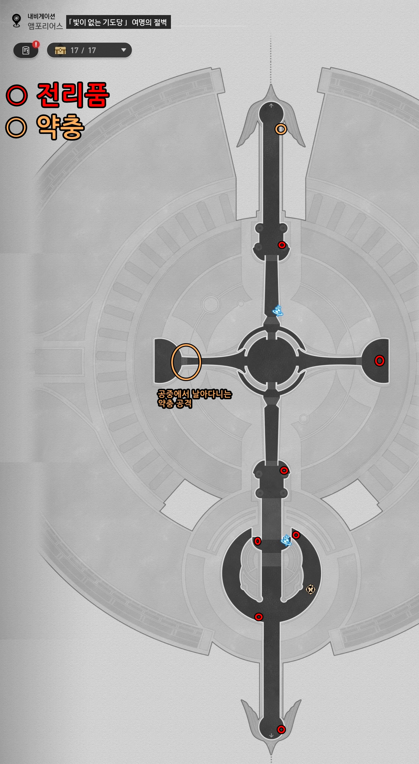 이번에는 앰포리어스 - 빛이 없는 기도당 - 여명의 절벽에 있는 전리품의 위치를 정리해보도록 할게요.