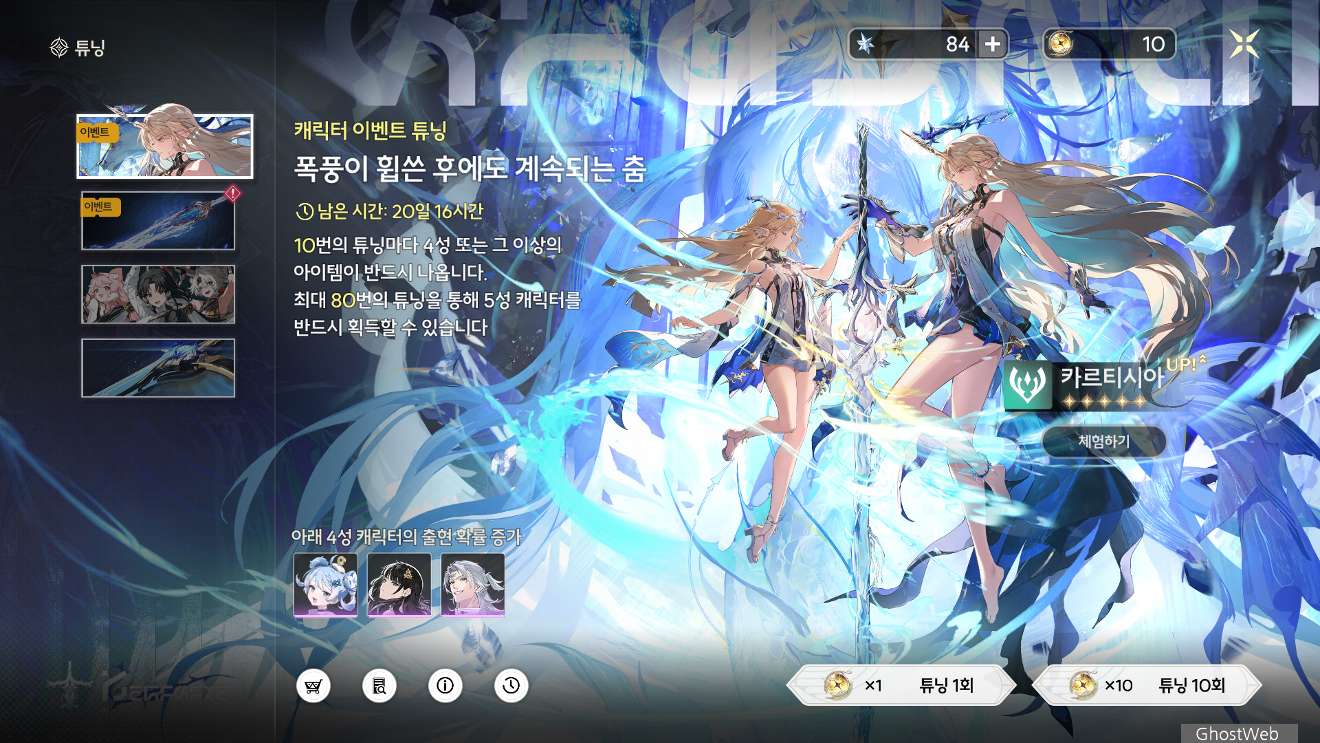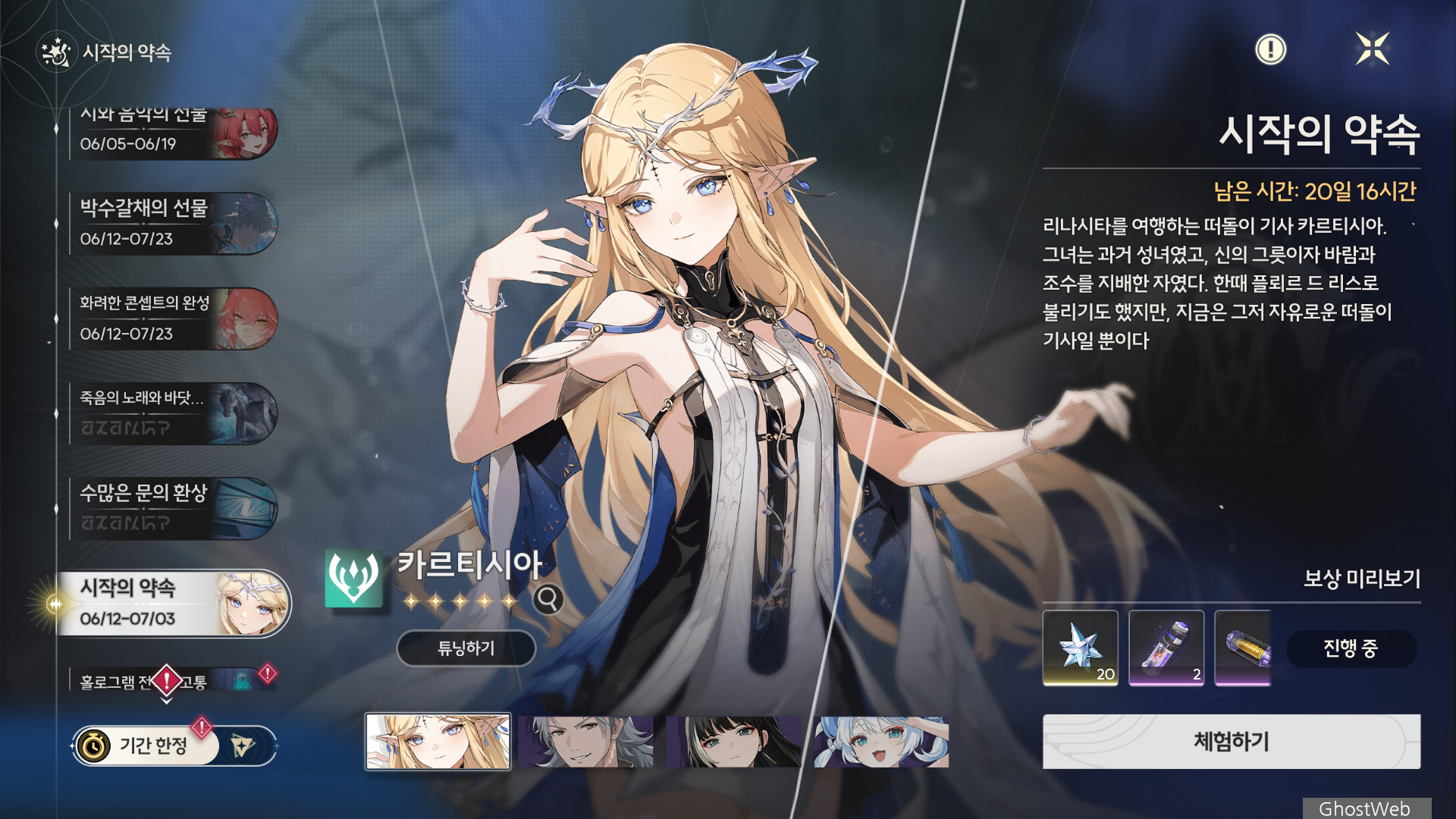 | 5 | 바람에서 피어난 희망 | 카르티시아 혹은 플뢰르 드 리스가 치명적인 피해를 받을 시, 카르티시아 혹은 플뢰르 드 리스는 해당 피해로 인해 의식을 잃지 않고, 카르티시아의 HP 최대치의 20%에 해당하는 실드를 획득하며 10초간 지속된다. 해당 효과는 10분마다 1회 발생할 수 있다. 공명 해방 · 기사의 소원대로 발동에 소모되는 HP가 HP 최대치의 25%로 감소된다. |
