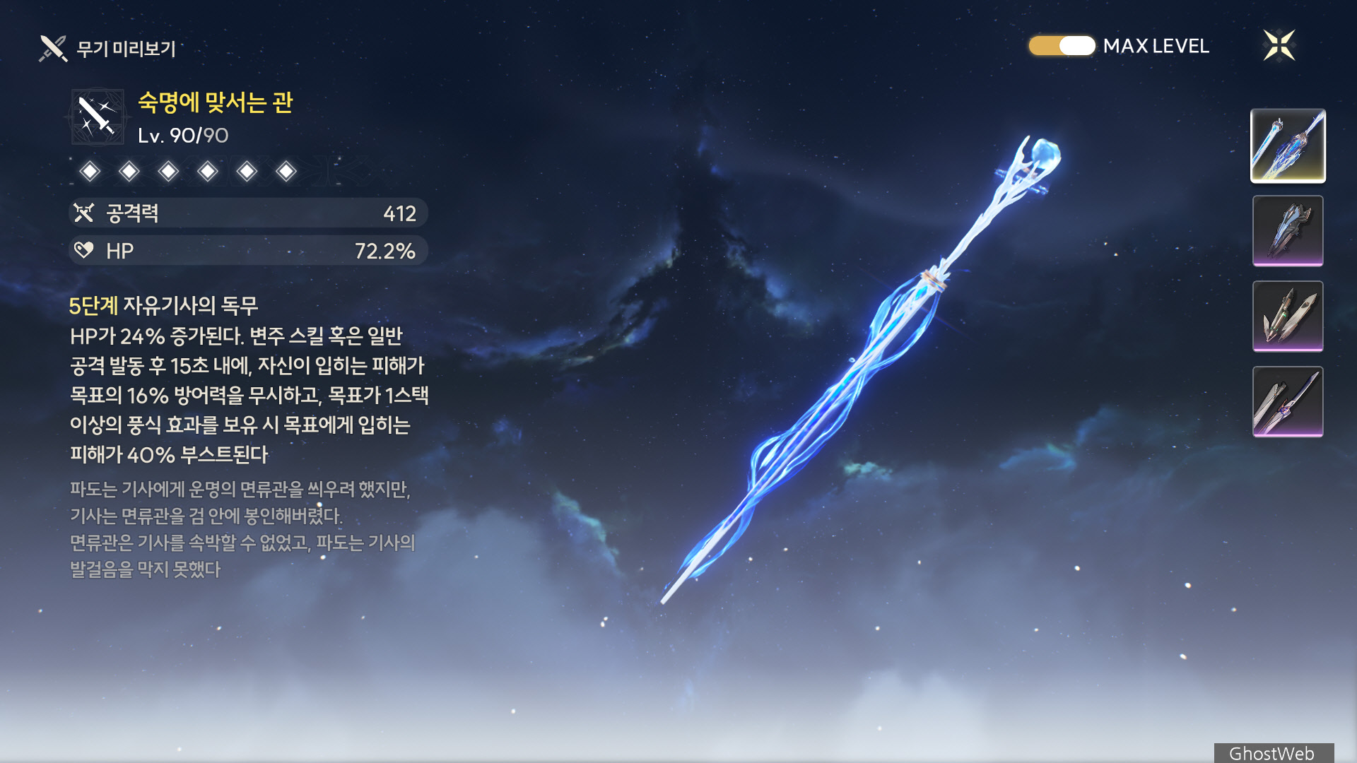 · 플뢰르 드 리스가 120pt의 결의 보유 시 공명 해방 · 폭풍의 울음을 가르는 칼날로 대체된다.