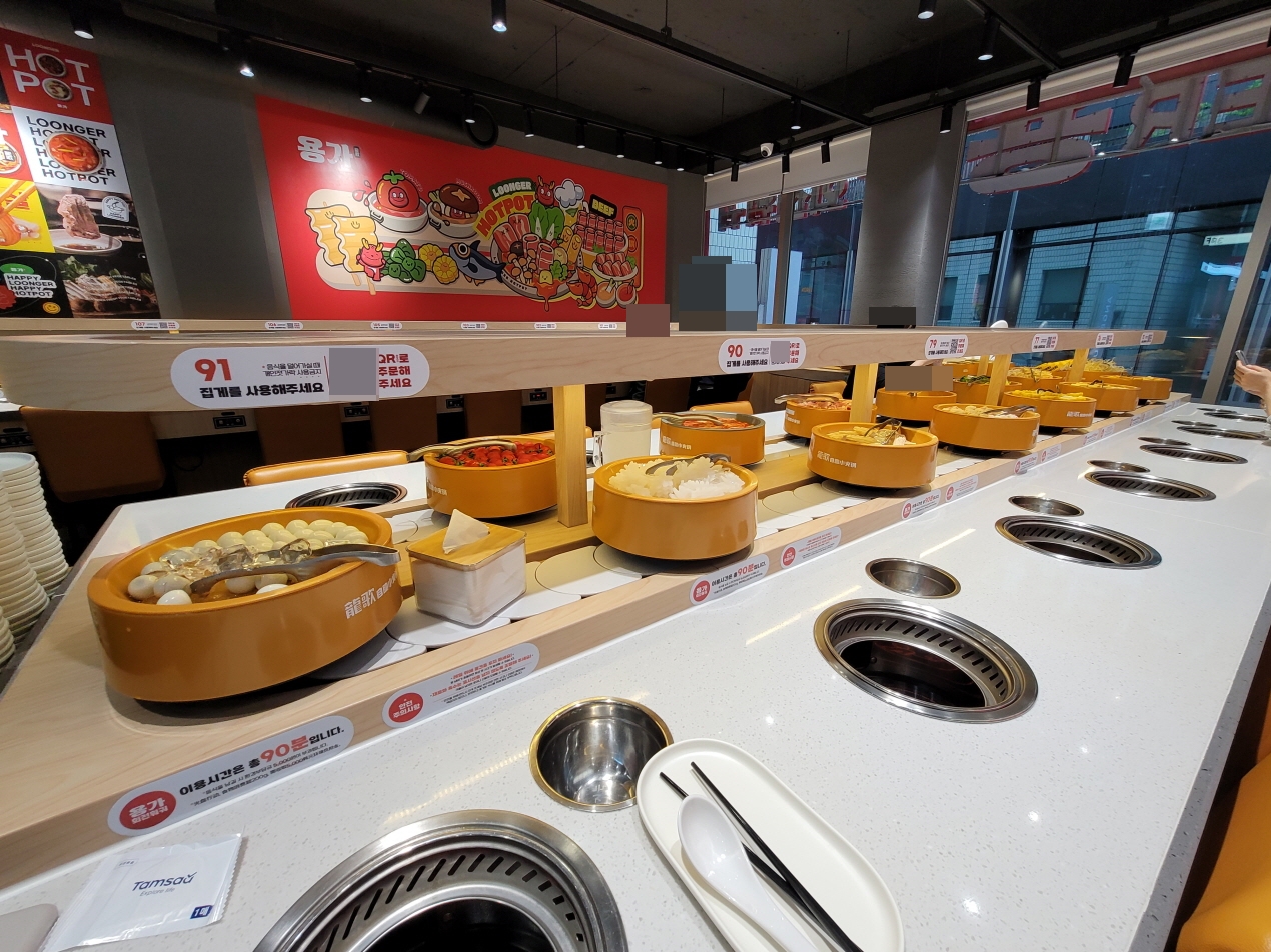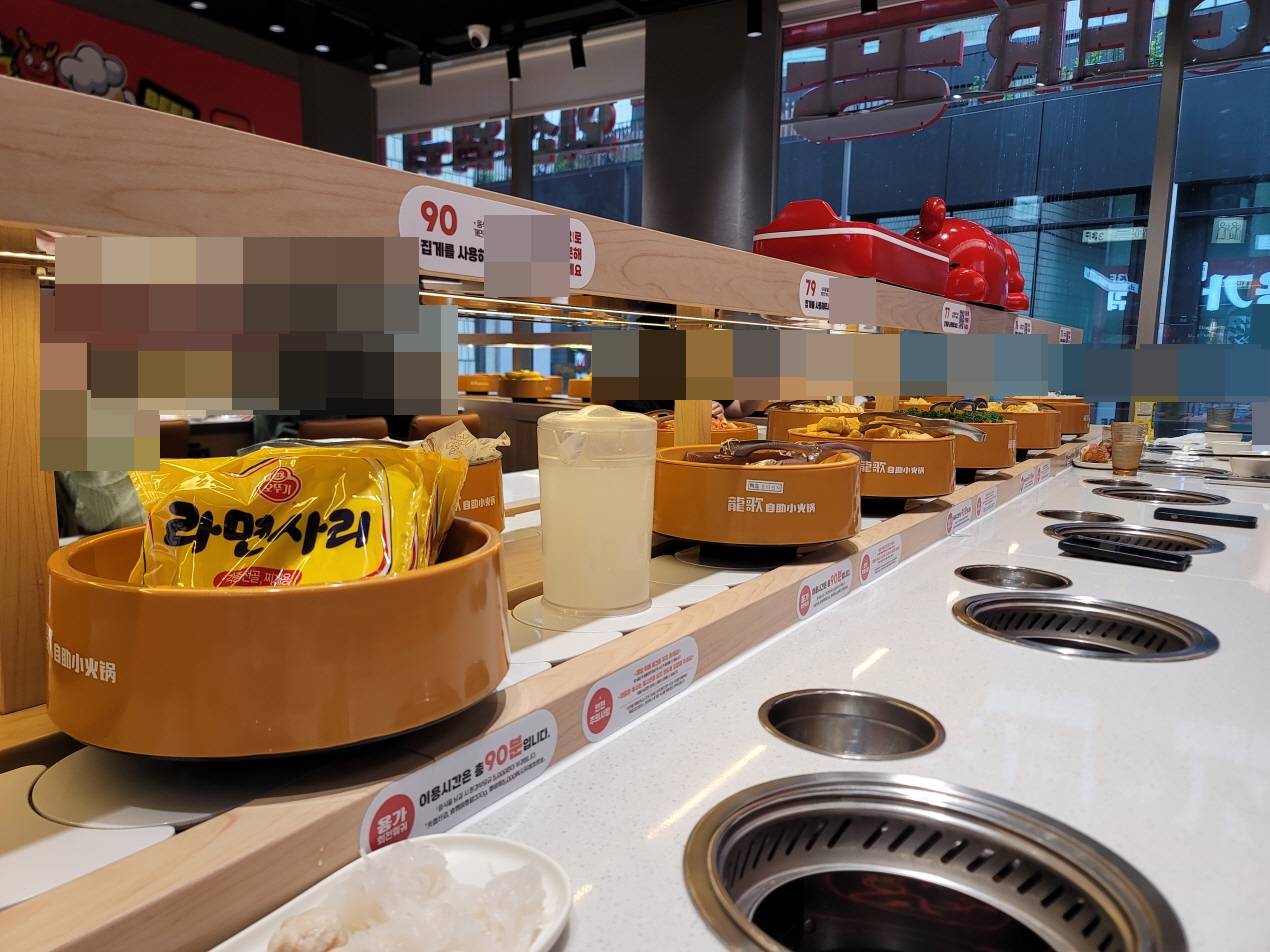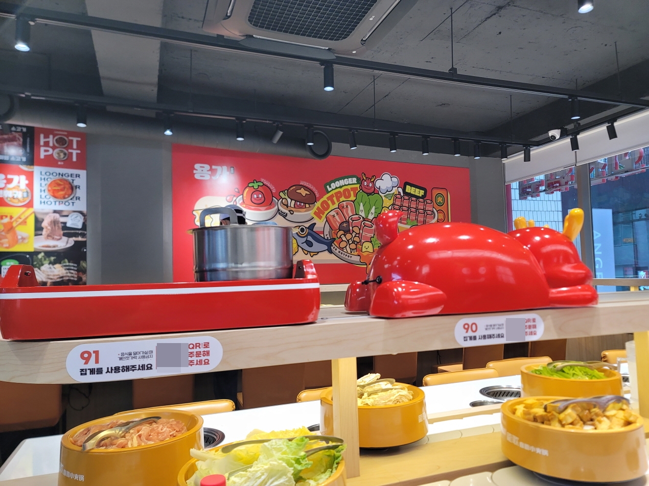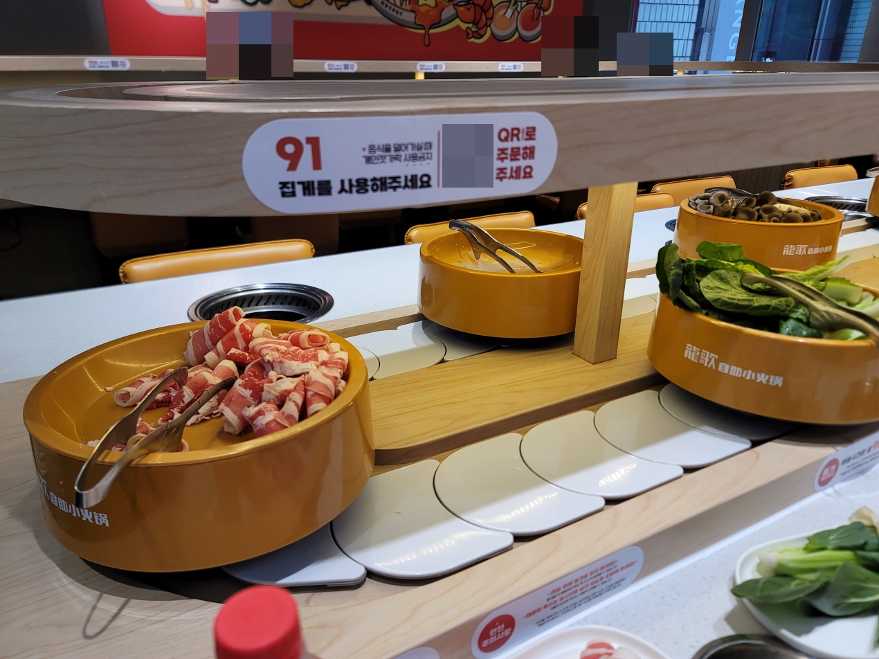 좌석 앞에는 전기 포트와 움직이는 레일이 있는데, 상단 레일은 주문한 국물이 용 열차에 담겨 해당 좌석까지 배달이 돼요.