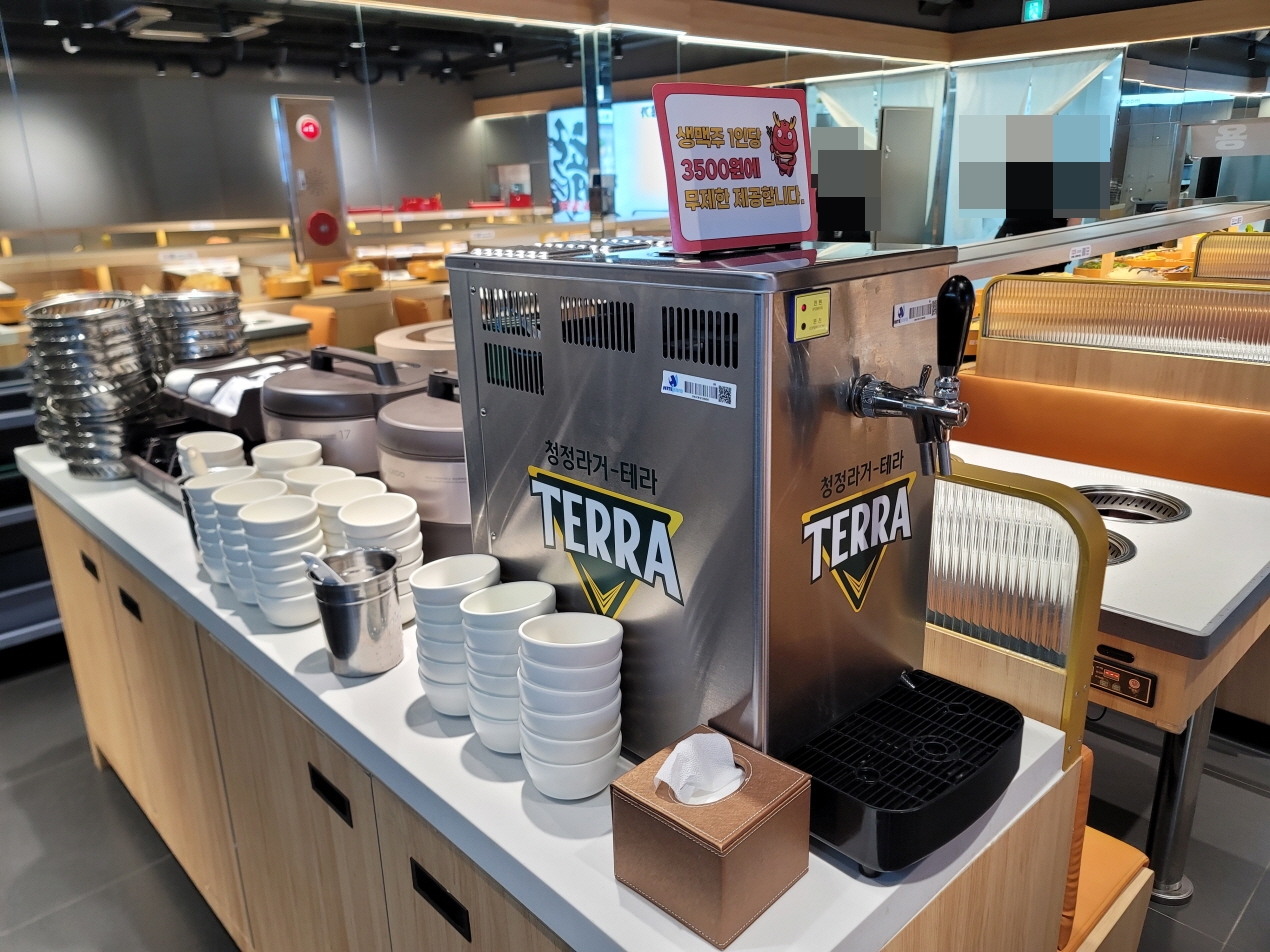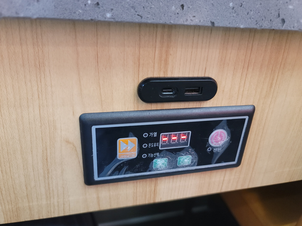 전기 포트 조절은 테이블 아래에 버튼으로 제어가능 하고 육수가 부족할 때는 레일 위에 물 통에 담긴 육수로 보충하시면 돼요.