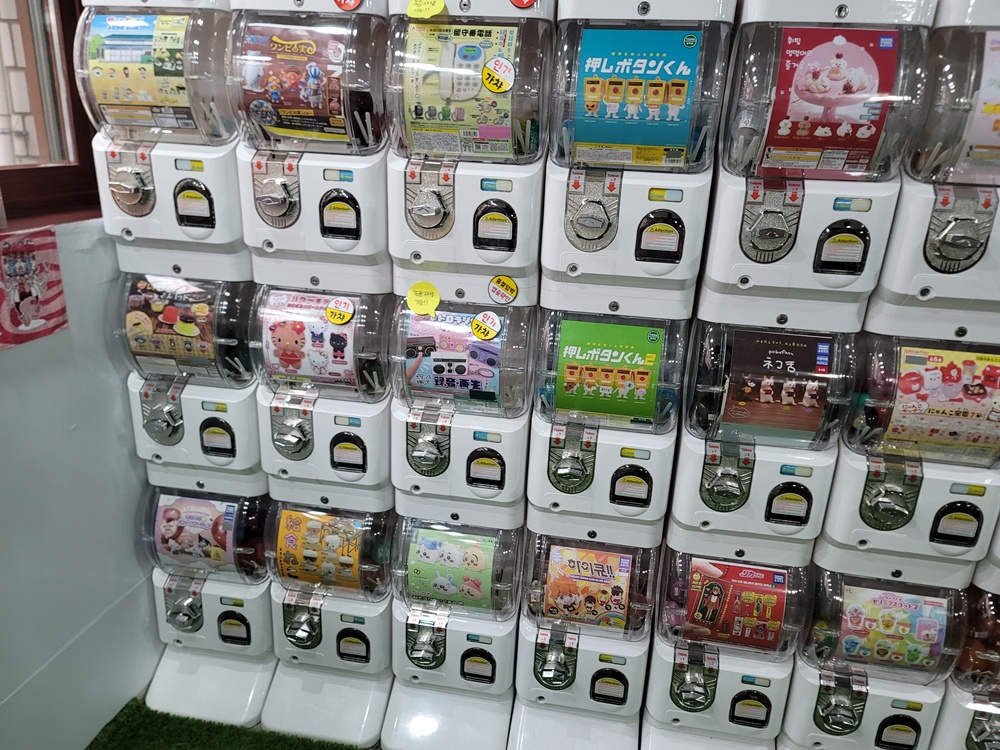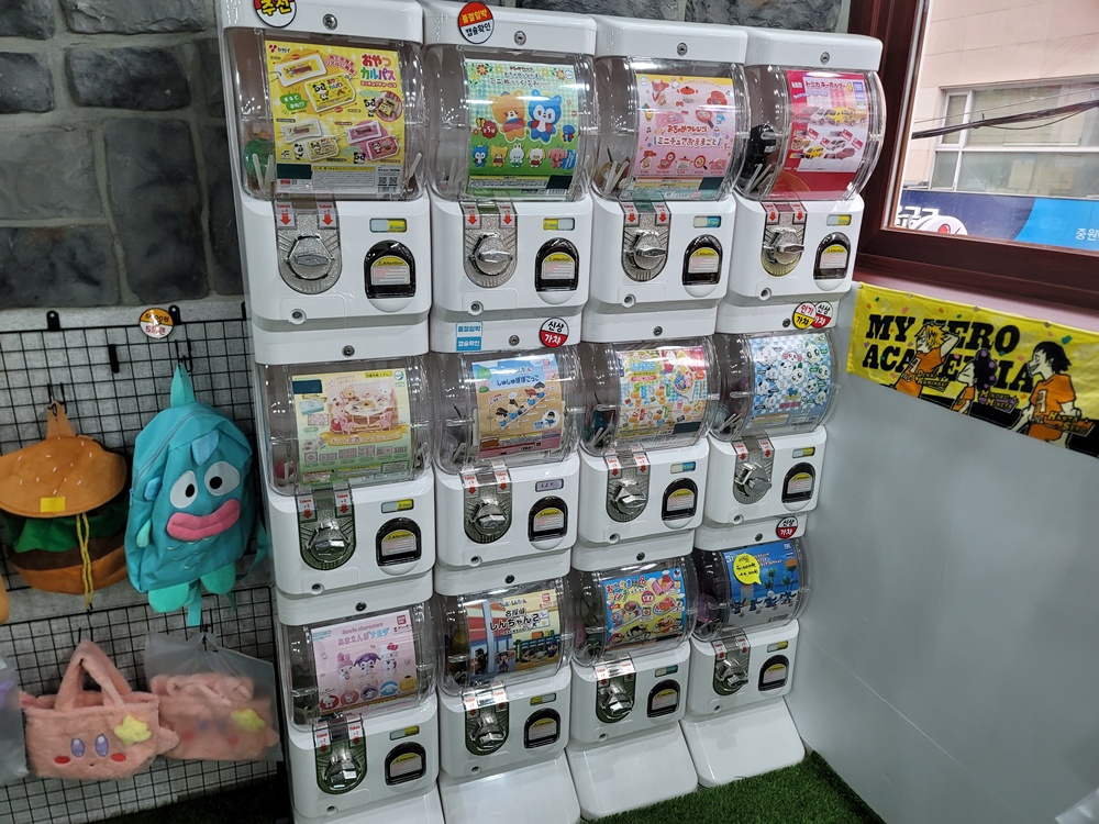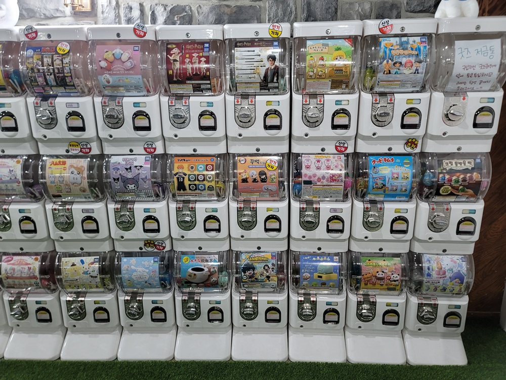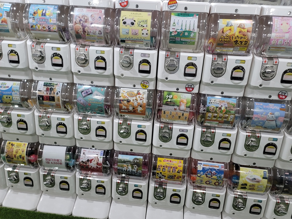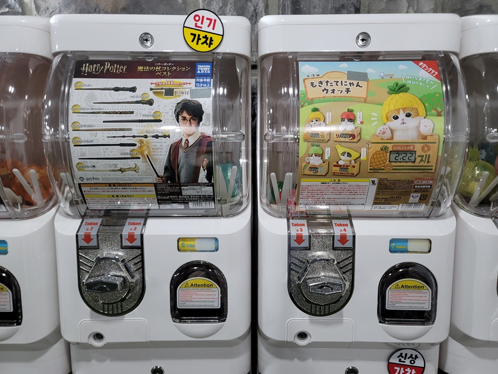 코인 교환기는 현금과 카드도 되서 바로 코인으로 교환이 가능하며, 갭슐을 직접 고를 수도 있어요.