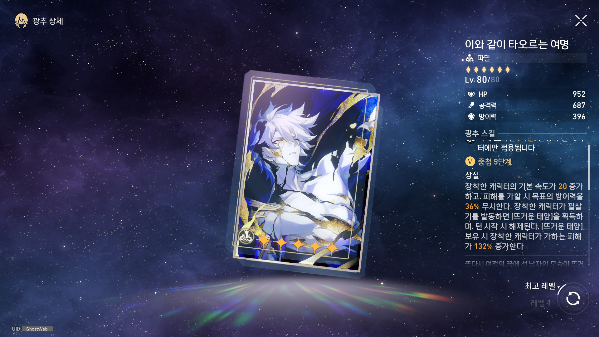 | 6 | 이지러진 석양, 영원토록 떠오르리 | - [불씨]의 초과 가능 포인트에 상한이 없어진다. - 전투 시작 시 [불씨]를 6pt 획득한다. - [기둥 · 죽음의 별의 심판]의 공격 발동 후 HP가 가장 높은 적에게 추가로 이번 공격 총 피해량의 36%만큼 확정 피해를 가한다. |