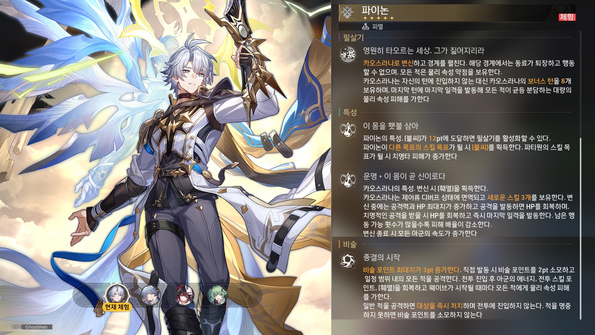 - 전투 진입 후 아군의 에너지를 25pt 회복하고, [훼멸] 2pt와 전투 스킬 포인트 1pt를 회득하며, 웨이브가 시작될 때마다 모든 적에게 파이논 공격력의 200%만큼 물리 속성 피해를 가한다.