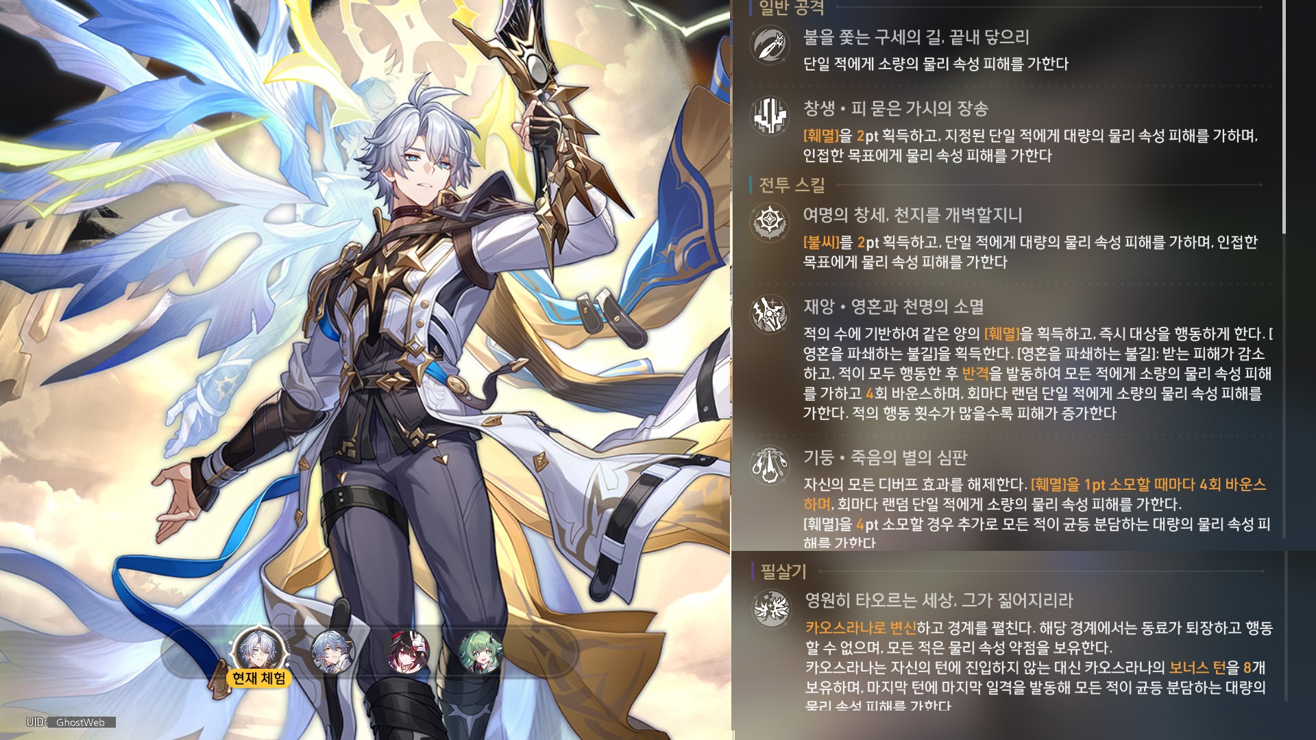 | 1 | 불과 빛, 선악의 화신 | - 카오스라나의 보너스 턴의 기본 속도 계승 비율이 66%로 증가한다. - 단일 전투에서 적이 1기 처치될 때마다 추가로 1.5% 증가하고, 최대 84%까지 증가한다. - 필살기 발동 시 치명타 피해가 50% 증가한다. - 지속 시간 : 3턴 |