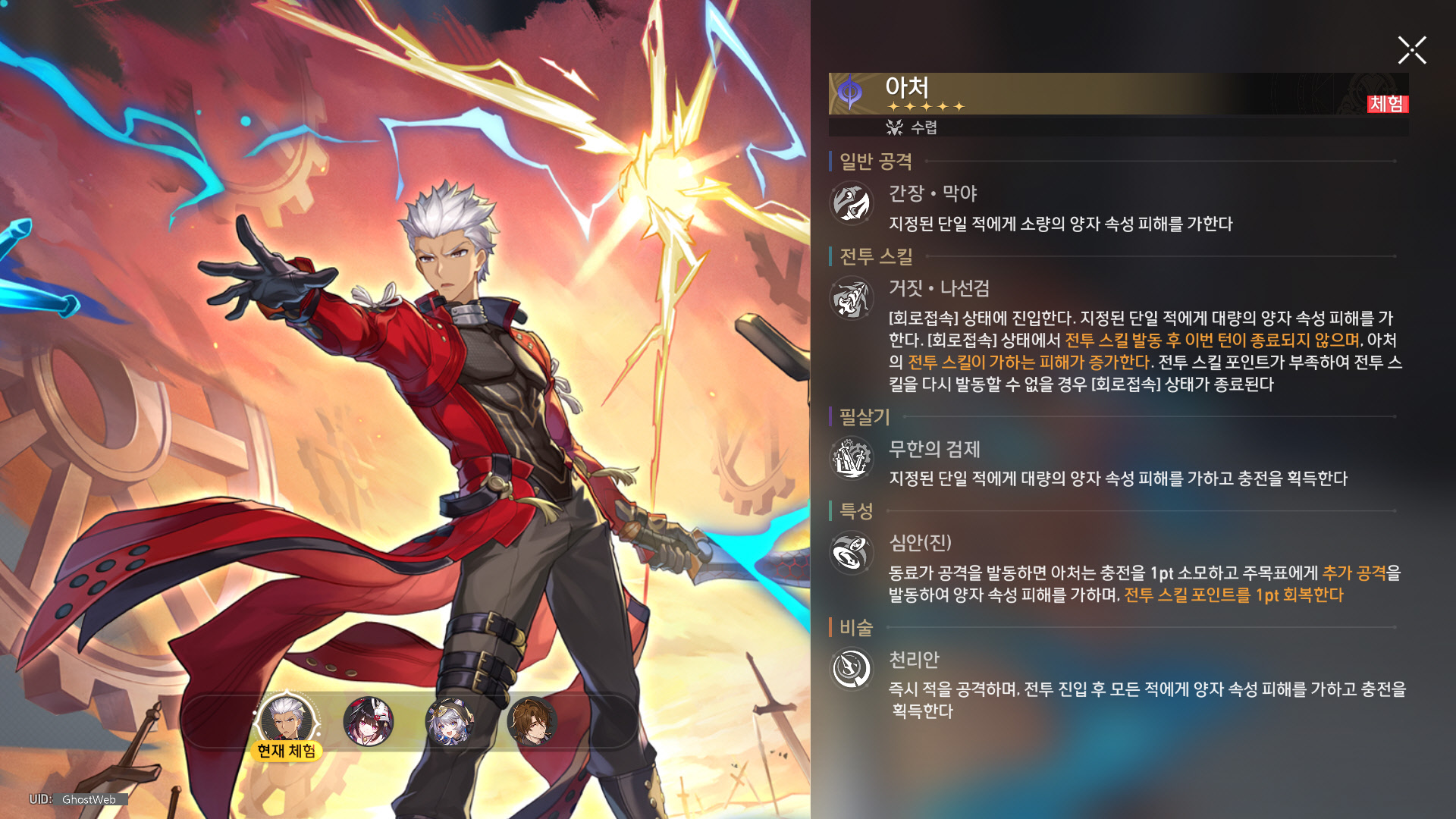 - 즉시 적을 공격하며, 전투 진입 후 모든 적에게 아처 공격력의 200%만큼 양자 속성 피해를 가하고, 충전을 1pt 획득한다.