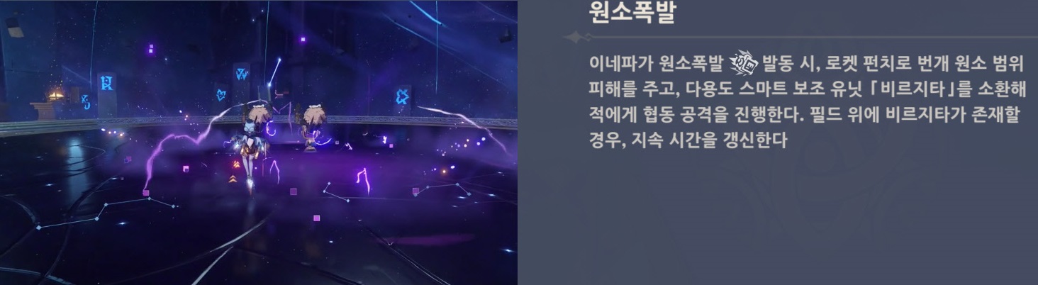 - 다용도 스마트 보조 유닛 [비르지타]의 로켓 펀치로 적을 쓸어버린다! 이네파가 비르지타를 발사해 번개 원소 범위 피해를 주고, 비르지타를 필드 위에 남긴다.