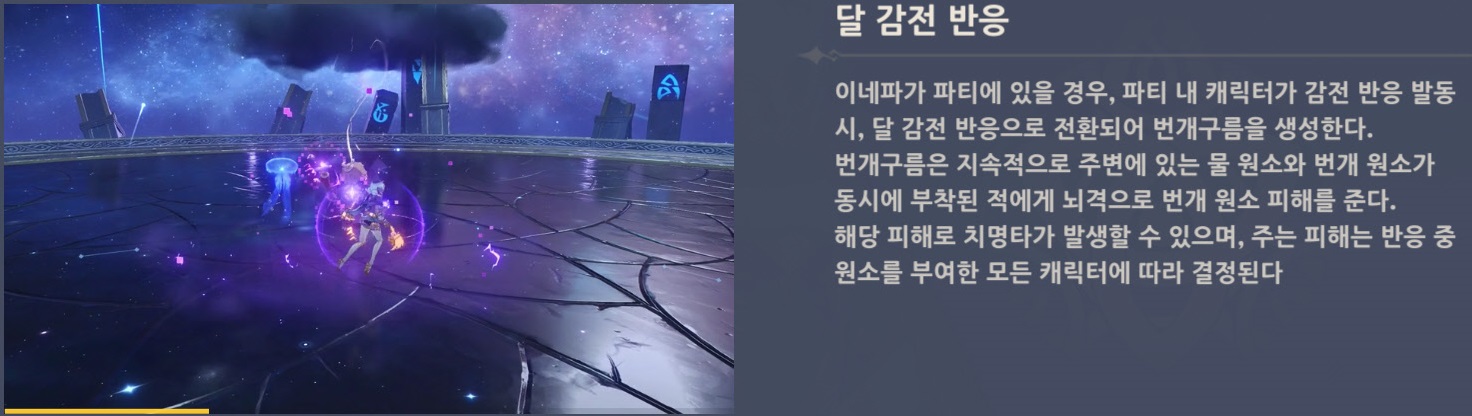 이네파가 파티에 있어 감전 반응 발동 시, 번개 구름을 생성하는데, 적에게 물 원소와 번개 원소가 동시에 부착된 적에게 뇌격으로 번개 원소 피해를 줘서 일정 범위 내에 적을 효과적으로 처치할 수 있어요.