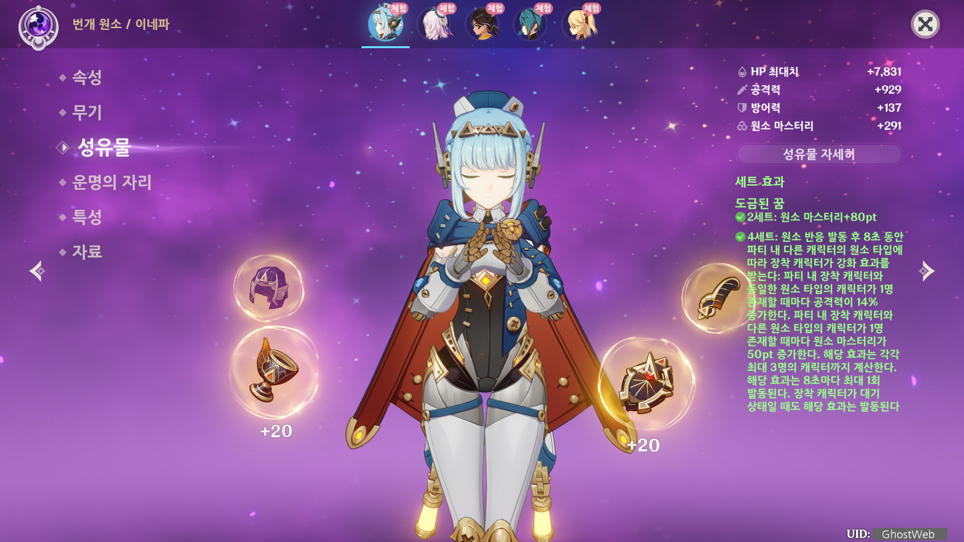 - 이네파 공격력의 6%를 기반으로 이네파와 현재 필드 위에 있는 파티 내 자신의 캐릭터의 원소 마스터리가 증가한다.