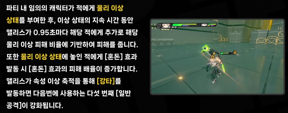 - 앨리스가 [강타] 발동 시 물리 이상 축적 효율이 12.5% 증가한다. (지속 시간: 30초)